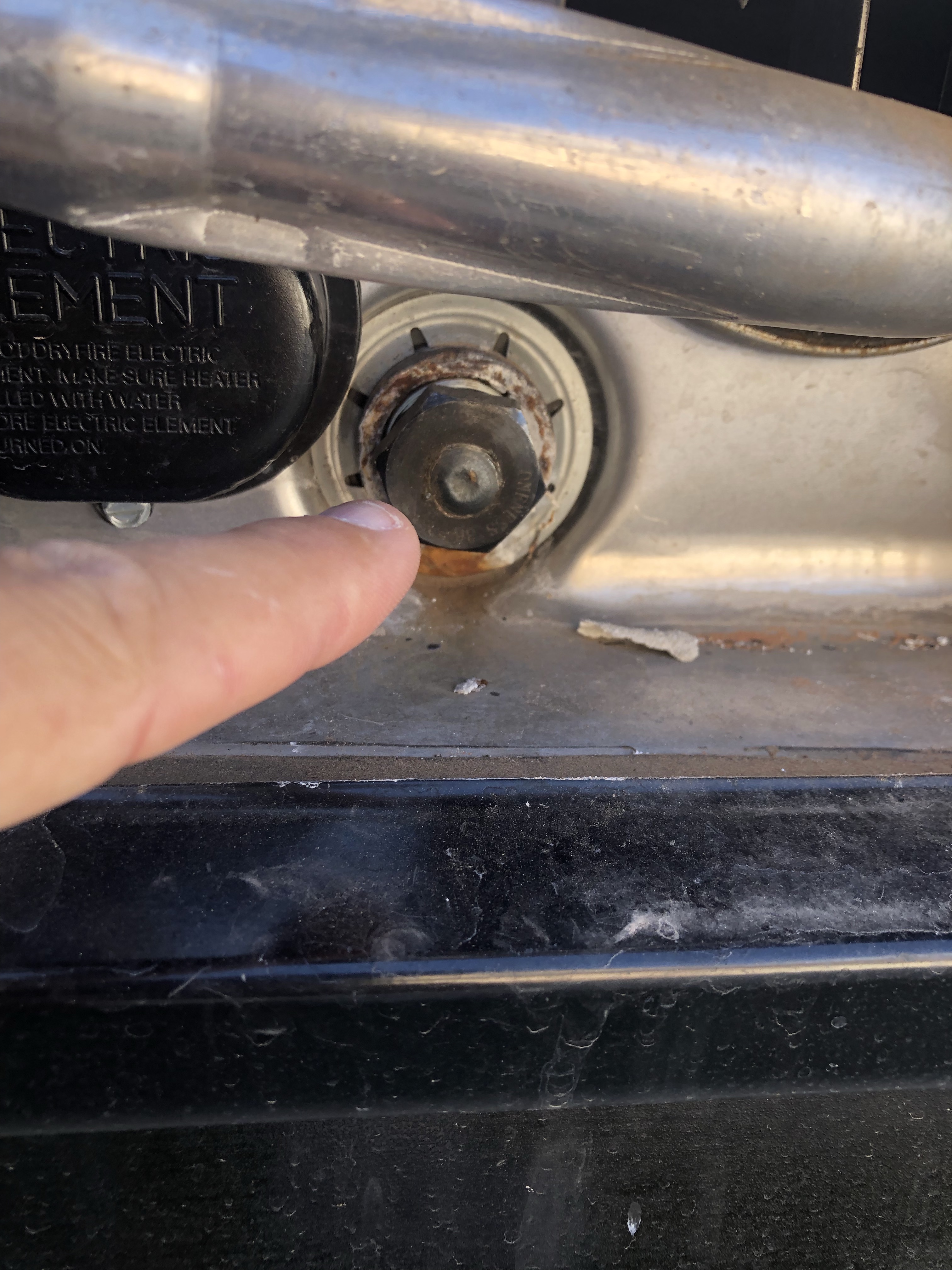 - Hot water heater. We turn the water heater off the night before, to let it cool down a bit. Turn the air compressor off. (see story below) relieve pressure in the heater by opening the pressure relief valve. Then remove the anode at the bottom of the water heater. This will take time to drain, I leave the anode just below where I removed it, and close everything up……time for a story. The water heater needs to be drained. The first time I did this, I left the air compressor connected and running – building pressure in the system. When I removed the plug/anode, water shot out 6-8 feet after it shot me right in the chest!