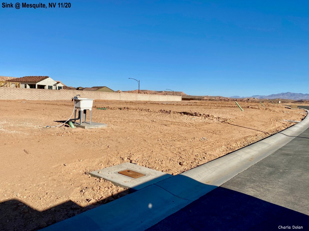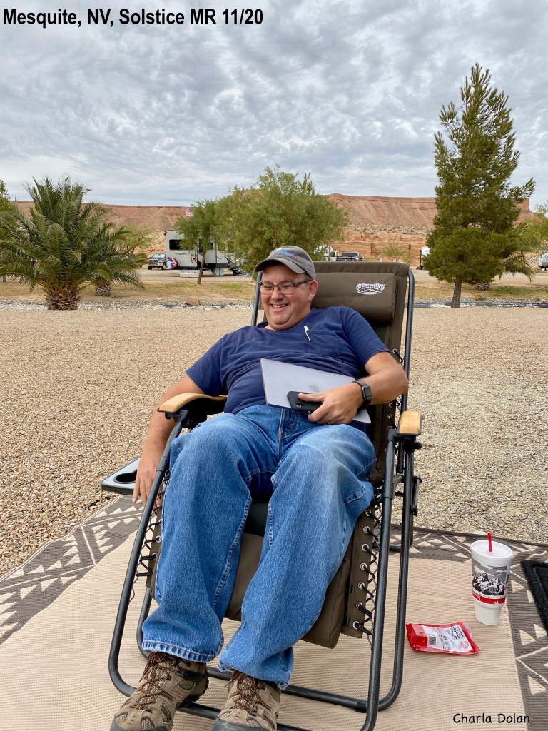 Friday, we left our house in Riverton at 7:30 AM. I drove the truck while Kevin worked from his laptop and our hotspot. The drive was easy with very little traffic. We got to the RV storage unit in Washington, UT, next to St George, at 11:30. It took about an hour to get everything hooked up; including airing up the tires. Then we drove to Mesquite, NV to Solstice Motorcoach Resort. Now, this isn’t a resort as I think of a resort but it is one of our favorite campgrounds. The campsites are very wide, in fact, you park your vehicle what equates to two parking spots over. It is gravel, with paved road. There are palm trees around what could be a water fountain and pond. No water there now. The view is stunning: we have what looks like the Wasatch front mtns to the east and then behind us to the west is a mesa. Beautiful. We quickly got set up and then Kevin sat outside and did more work. (No picnic table).