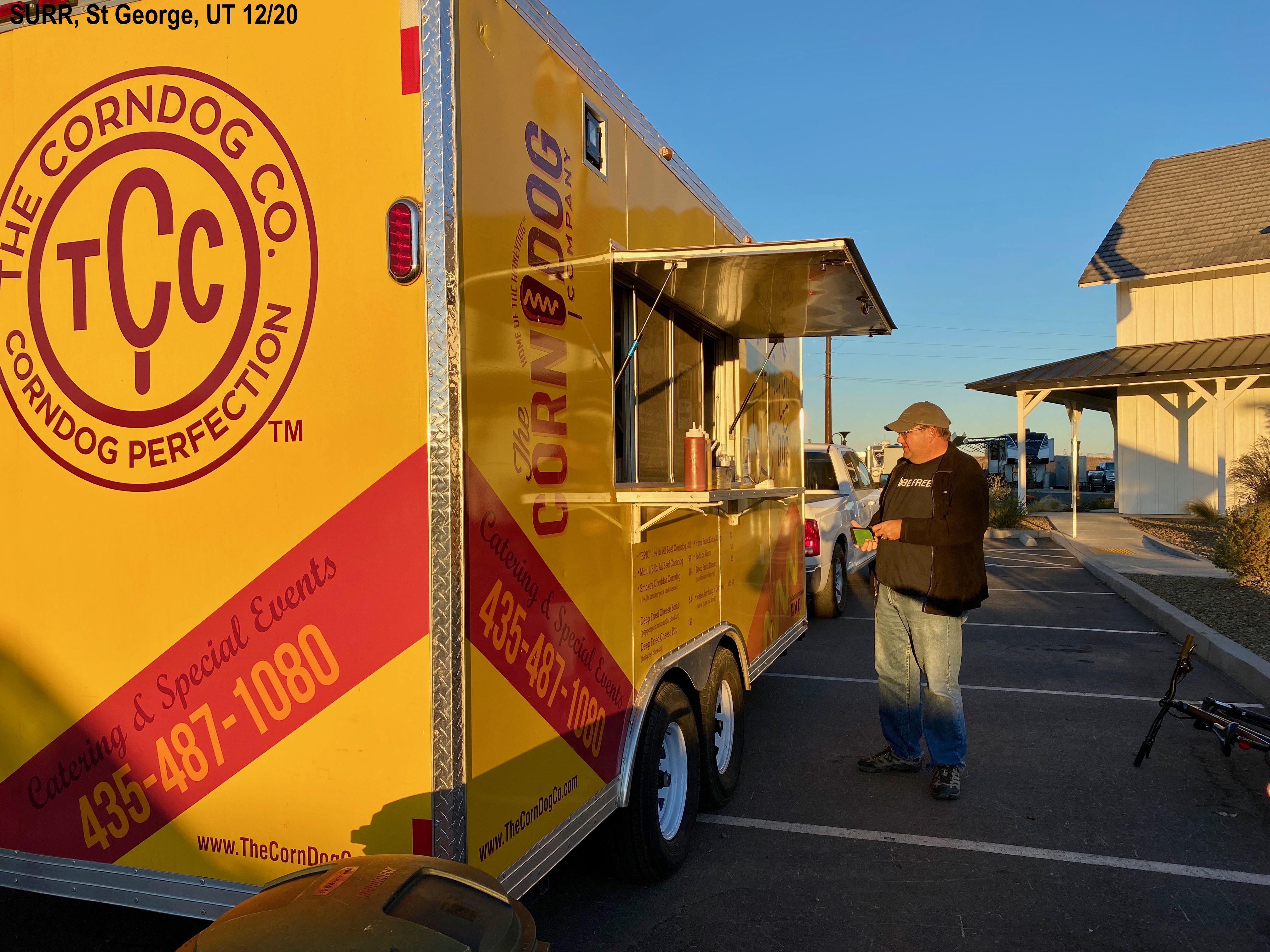 We drove to Kanab and got ice cream at a gas station. Then on through Fredona. We remember stopping at Pipe Springs with my Aunt Goldie and Uncle Jim years ago. We though it was very interesting and had lots of history. Kevin and I passed the turn off and then turned around to go get his National Park Passport stamped. On the tiny road, I remembered that the Indian Reservation is extremely high with Covid. We turned back around when we saw a sign in the middle of the road saying no visitors. On through Colorado City and Hilldale. In Apple Valley we saw a “tiny home resort” and of course had to turn around to see it. The tiny houses are literally smaller than our trailer. HAHA The road down to Hurricane is fun: drops off quit a bit. We came back to camp and just read and watched movies. Dinner was corn dogs from a food truck that came to our RV park. It wasn’t what we thought the batter would be (sweet) but it was good. We were glad to support the truck.