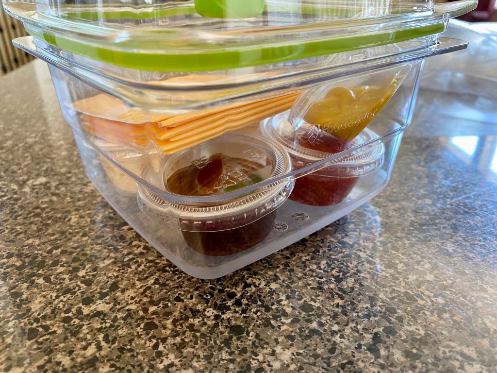 At home, I put mayo, mustard, bbq sauce, and ketchup in little round containers, then put it in a Food Saver container that took the air out. It worked great. Our campsite has a very large green grass area right out our slide window. It is the dog park. HAHA I am quite entertained by watching big, burly men, scrawny little old ladies, and all in between pick up poop. Disgusting and funny.
