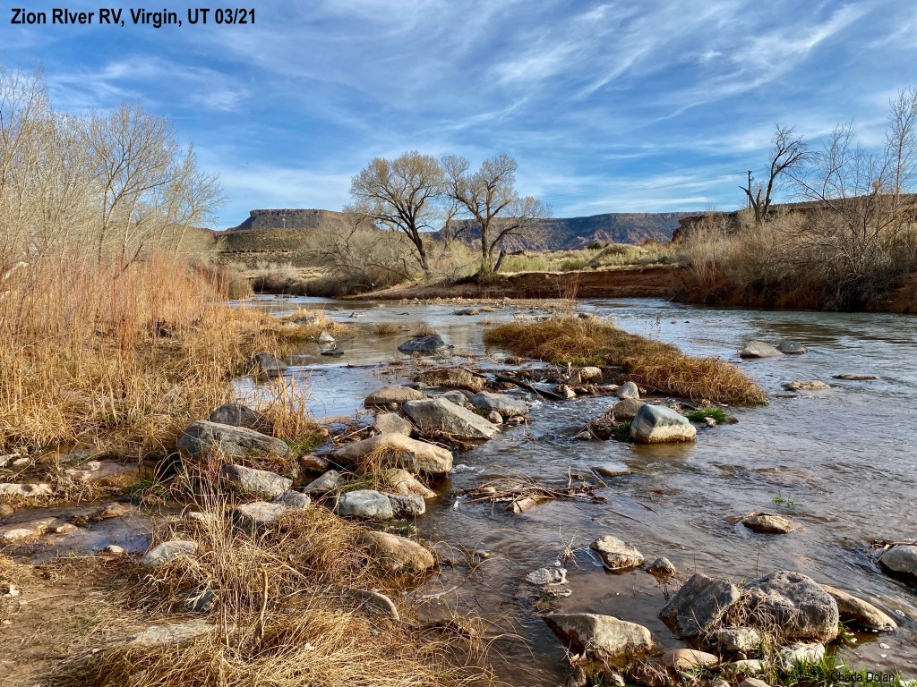It was a beautiful drive, with outside temps 64-73. The traffic was lighter today, until we got past Cedar City. Then we had slow trucks passing slow trucks and it really bogged the traffic down. That is okay, though, because our only hurry was just the excitement to get to camp. Kevin knew we would need to air up at least one tire on HOWE when we picked it up at storage. It went pretty fast. Got to Zion River RV Resort and found our site. Due to Covid, the campground emails you the site and a map. It works out fine. Right behind our site is the Virgin River. It is still winter, and everything is dry. Of course, it is the desert too, but no leaves out yet. Kevin started setting up camp outside but the water wouldn’t hook up right. We got a new part from the campground office but it didn’t fix it. Kevin informed them at the office and they radioed someone who was at the campsite before we could even walk back. Took two people but they eventually got it working.
