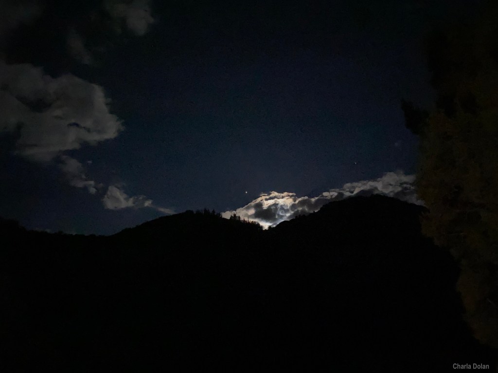 Amazing view of mountains, moon, clouds, planet, and stars.