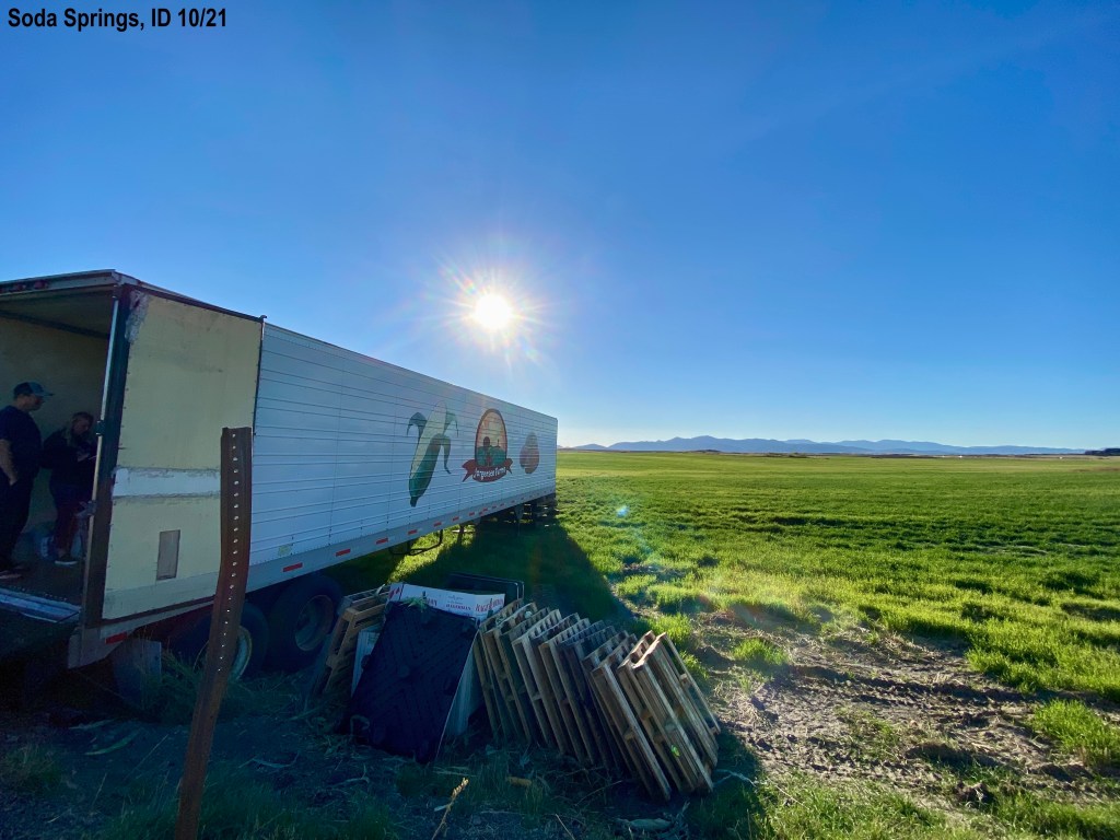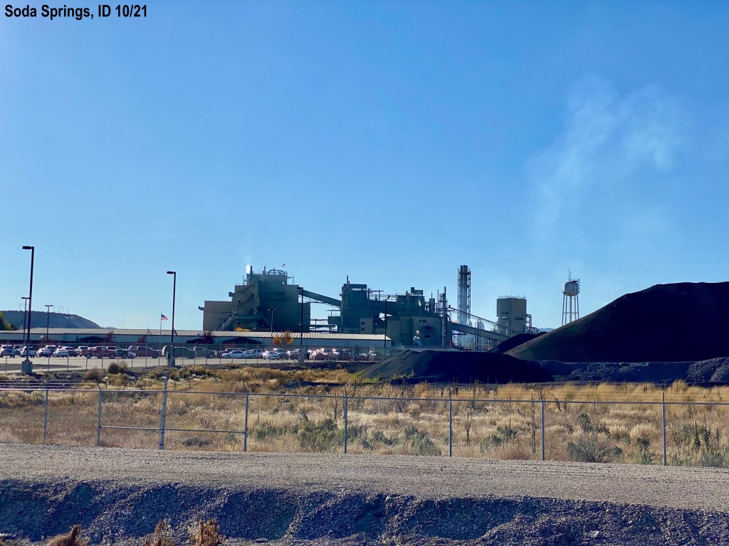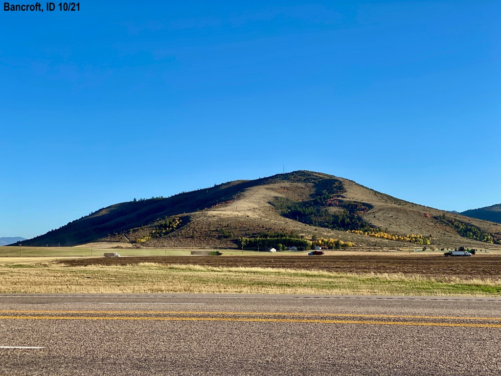 There is a highway that passes our campground and Kevin was curious about where it goes because most of the traffic is semi trucks with either cattle haulers or refers. We drove the road, US Hwy 30 to Soda Springs, ID. The land is covered with farms from Lava Hot Springs to Soda Springs, with one mountain top (6000 ft) in between. The flat farm land goes on for miles until you see a hill/mountain. Most of the crops have been harvested already but we saw potatoes being harvested today. We also saw new growth of fall plantings. We immediately said we want to come back to this area and explore more. Soda Springs has a huge Phosphorus plant. We first thought it was a huge power plant. The name on the sign is Bayer with the same logo as the company that makes aspirin. We saw an enormous “hill” that turned out to be tailings. 🙂 Also several leech fields. We want to learn more about this place.