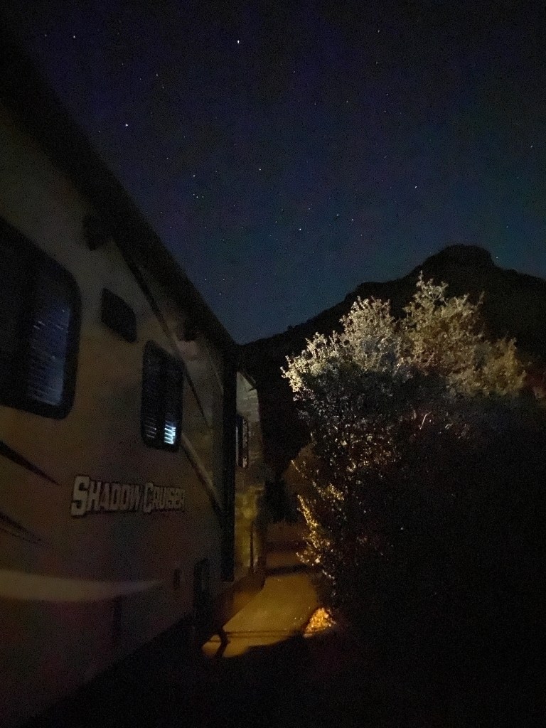 Friday 11/05/21 For several reasons, this day took longer than most. Of course it starts at the local Maverick gas station for gas, drinks, and ice. Since HOWE (our travel trailer’s name, short for Home On WhEels) is at the storage spot in St George (4 hours south), where it is nice and warm, we need to take a cooler. Once we get to HOWE and the fridge is cold, we can transfer the items. As we passed Rowley’s Red Barn, in Santaquin, UT, we decided we should stop. I grew up with Rowley’s as neighbors and in school. They had fresh apple cider donuts and I just had to have a box. We also got fresh apple cider and some apples. The “barn”-store has ice cream, candy, boxes of meat, all sorts of breads made in that town as well as a variety of salsas, spreads, you name it, all made locally. We like to support things made and grown locally. Down the road we went, eating our just-out-of-the-oven warm donuts. At Cedar City, we saw the remains of a van that had rolled off the side of the road. The emergency responders were there working. Usually when you pass a wreck the speeds will pick up. But they didn’t. We moved a few yards, slowly, and then came to a complete stop. So stopped, that I turned off the engine. 35 minutes. I even saw people walking around the center median looking ahead. Finally we got moving again. We saw the police standing by a barricade that stops people from going into a construction site on a bridge. On the tow truck was a pickup that was completely smashed, who obviously hit the barricade. We aren’t sure someone could survive after what the pickup looked like. We finally got to St George and HOWE. Then, the jack wouldn’t raise because the batteries are dead. Why? We don’t know. Kevin got on the ground and checked the fuse; it was good. Thankfully Kevin was able to charge it from the truck. Standing there watching him, I felt this red-hot stab of pain on my left hip. Oh, that was weird. It didn’t take long at all to get the jack going and get all hooked up. As I was getting into the truck I felt a red-hot stab of pain at the top of my right leg. Ouch. That was weird. As we were driving, I felt the pain still on the left hip and right leg. Soon I felt the red-hot stab of pain on my left shin. I pulled up my pant legs and there was this huge black ant! I squashed it immediately. I was surprised how big it was. I started squashing movements all around my body! When we got to Snow Canyon State Park and our campsite, I went in and checked and yes, there were bite marks! Ugh. We thought it was strange that Kevin didn’t feel any since he had laid on the ground. Kevin decided he wanted pizza so we drove down the canyon to the city (only a few miles). We drove to a pizza place we had been to before with our friends, Bryce and Heather. So sad, it was out of business. It was #1 on Trip Advisor. Probably couldn’t hold on through Covid, but not sure. Okay, looked up #2, drove some miles to that place and nope it was closed. Remodeling, the sign said. Looked up #3, drove around the city and this place was so packed, we couldn’t even find street parking for more than 6 blocks.We are sure it would have taken forever to get in. Keep going. The next place we found, around the city, was Pier 49 Pizza. There wasn’t a wait and the dining room was empty. Yes! We had the Dinner for 2 which included Cheese bread, our pizza of 1/2 bbq chicken and 1/2 combo, and then a dessert pizza. Very good. Not our favorite pizza but it was good for tonight. 🙂 We made many circle 8s around the town. 🙂 Back at HOWE, we sat outside and watched the stars. Too bad a large motorhome next to us kept their bright outside light on all night. It made a difference in how we could see the night sky. As Kevin went to bed…he said he had several ant bites!