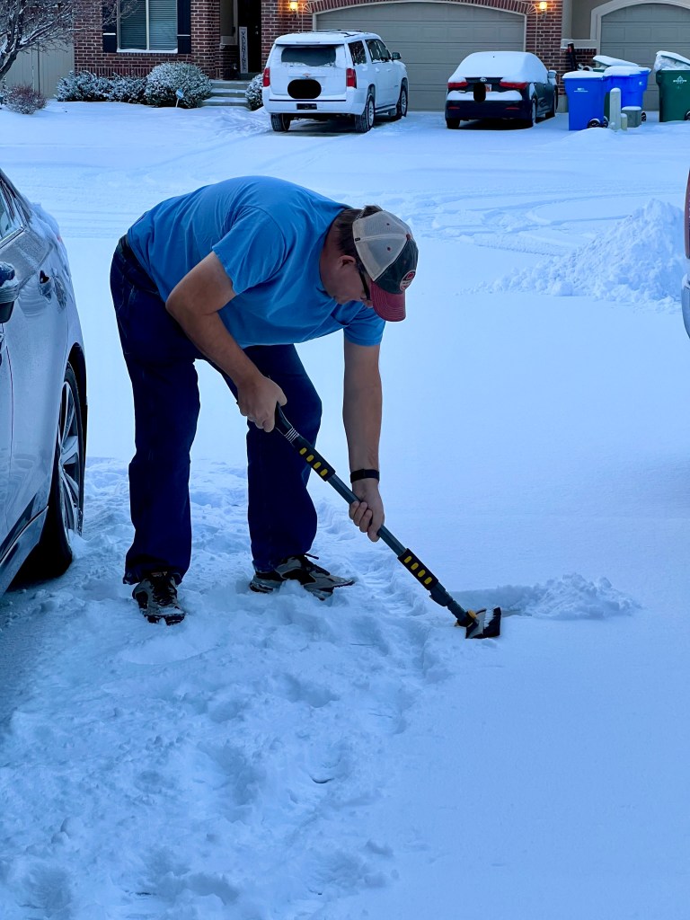 A week before we moved, our snow shovels sold (NOT doing cold anymore), Kevin gets the ice scraper out to “shovel” the large driveway. Just kidding. 🙂 He used it on the car.