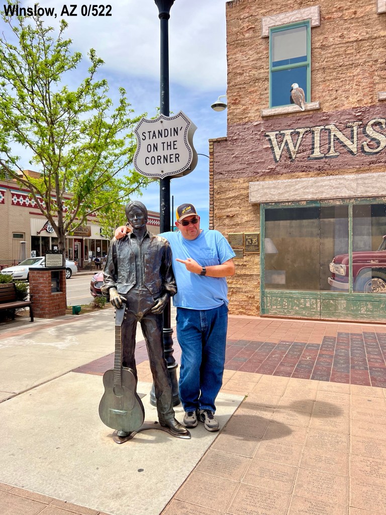 Saturday 05/07/22 Flagstaff, AZ Today was drive and explore day. Kevin wanted to go to Winslow, AZ. It is famous for some song by the Eagles. Sounds fun, let’s go. Of course we wanted to stay off the freeways. We went on Hwy 15 to Leupp, AZ, which is on Navajo Nation reservation. There wasn’t a lot there and we didn’t stop. Took Hwy 99 south to just west of Winslow. We were in awe of the change in landscape! On Hwy 15, there is a lot of cedar trees and some big hills. After awhile, it is what you typically think of AZ desert, dry, more dirt than growth, with a few red rocks. We saw a few homes scattered along the way.