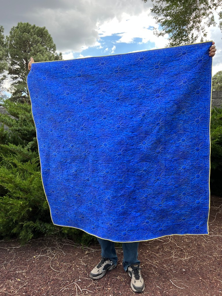 When I took it to the longarmer (a person who operates a large machine that puts the designs on quilts) we were looking for a design. We saw the sunflower design and she said she thought the sunflower had something to do with Ukraine. Kevin looked it up on his phone and it is Ukraine’s flower! So yes, that had to be the design.