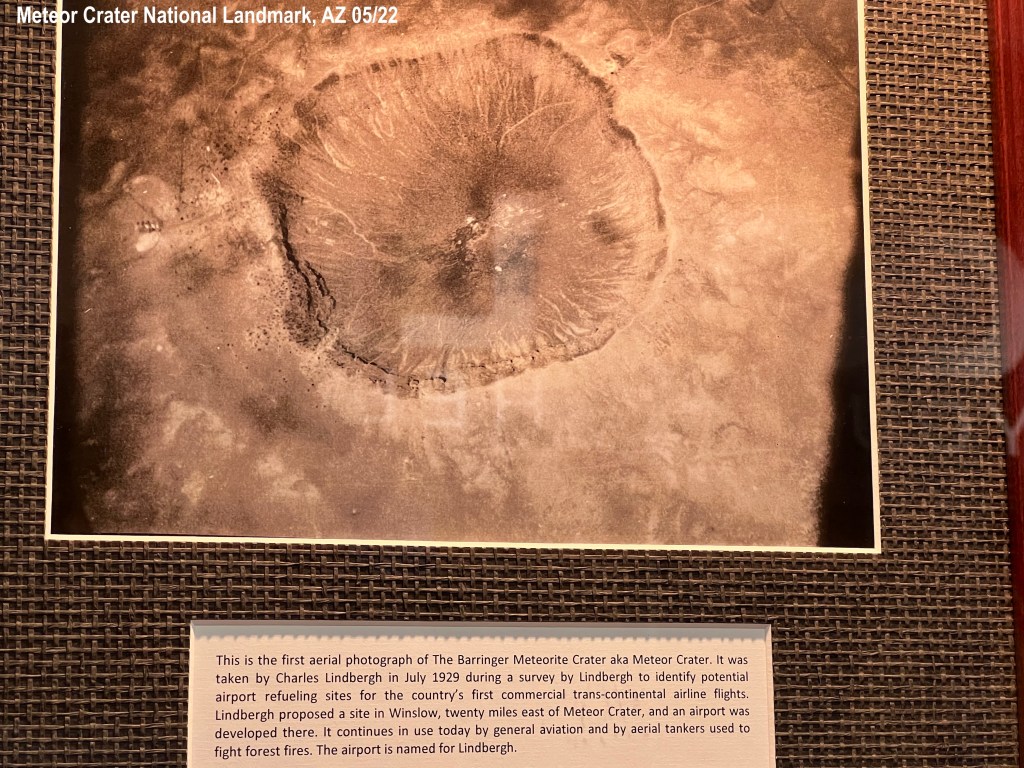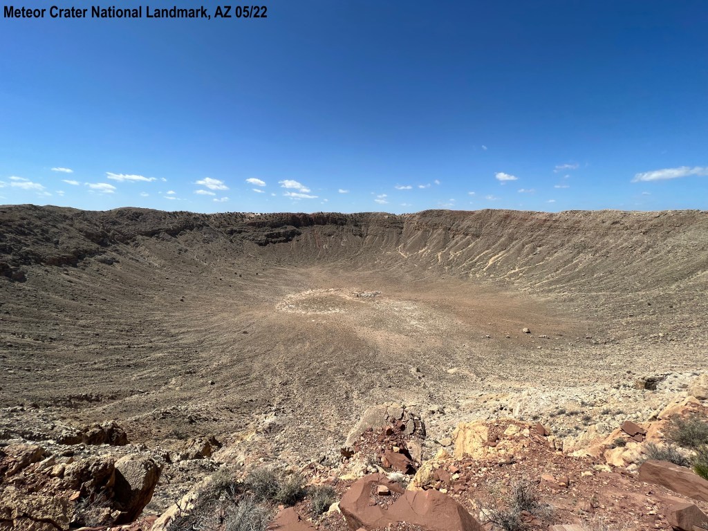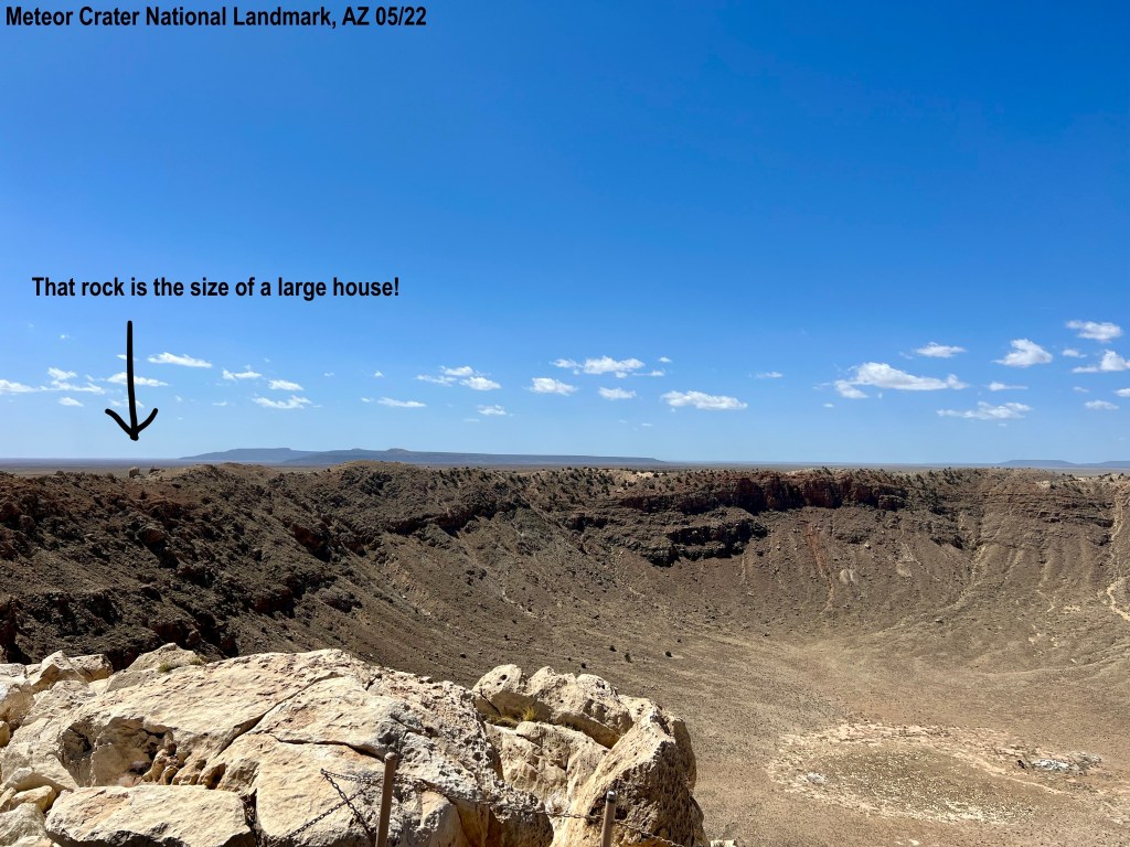 We went to Meteor Crater National Landmark. Kevin thought it would be just a tourist trap but I was very excited. Growing up I had always thought the crater was the size of a car. In researching it, I found out it is huge. We got there and it wasn’t crowded. $24.00 a person, includes everything, even a guided tour that takes 1.5 hours. We watched the film first. It was done very professionally, I thought, and had captions! This is great because I am completely deaf. Every screen in the museum had captions! I was so happy. We walked out and looked at the crater. It can hold 20 football fields and 2 million people in the stands! Now that is big! I was impressed with all the information…it would say, “We think it was (50,000 years ago),” for example. They would tell of different theories and such that people had over time. That impressed me. The estimated speed the meteor was traveling is 26,000 miles an hour. It is a mile across and 550 ft. deep.