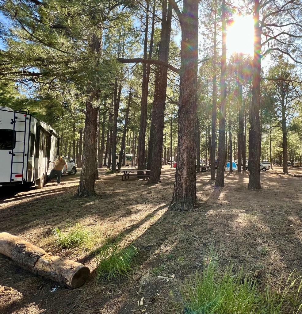 Funny story…When we were camping in Needles, California, I started looking for places to camp over Memorial Day weekend. I didn’t know this area (Flagstaff), having only driven here and back to Phoenix with Kevin in January 2021. I wasn’t sure about “boondocking” around here so didn’t even look into that. Plus, at that time, Kevin thought he would need cell service to stay in touch for work. (We didn’t have Starlink yet.) I looked up and down I-17 and no place had openings. Finally, finally, found Fort Tuthill Campground. Wahoo! Booked it. Then the other day we were driving around exploring the area and we see “Fort Tuthill” exit…it is literally 15 minutes away from the campground we are at in Flagstaff! HAHAHAHA Such a “big” travel trip. 🙂