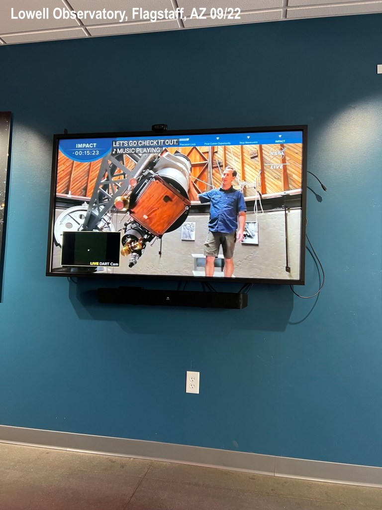 As we sat down in front of the big screen TV, it was on NASA TV and the countdown was 54 minutes. I was fully able to see and read all the captions and NASA did a great job with the captions. Full immersion into what was happening was provided for me and I couldn’t have been more thrilled at this event. Lowell Observatory was showing the event in all corners of the complex plus the auditorium. It was nice to make it so a lot of people could watch. Soon we had people standing at the back of the room and at the large, open doors the side. My heart was pounding so hard with excitement! It was thrilling to watch the “target locked”, “NAV has full control”, and all systems good. We all clapped when the astroid was hit. I loved watching the interviews with people before and after and just reading about all the time, planning, work, and what is next. Incredible.