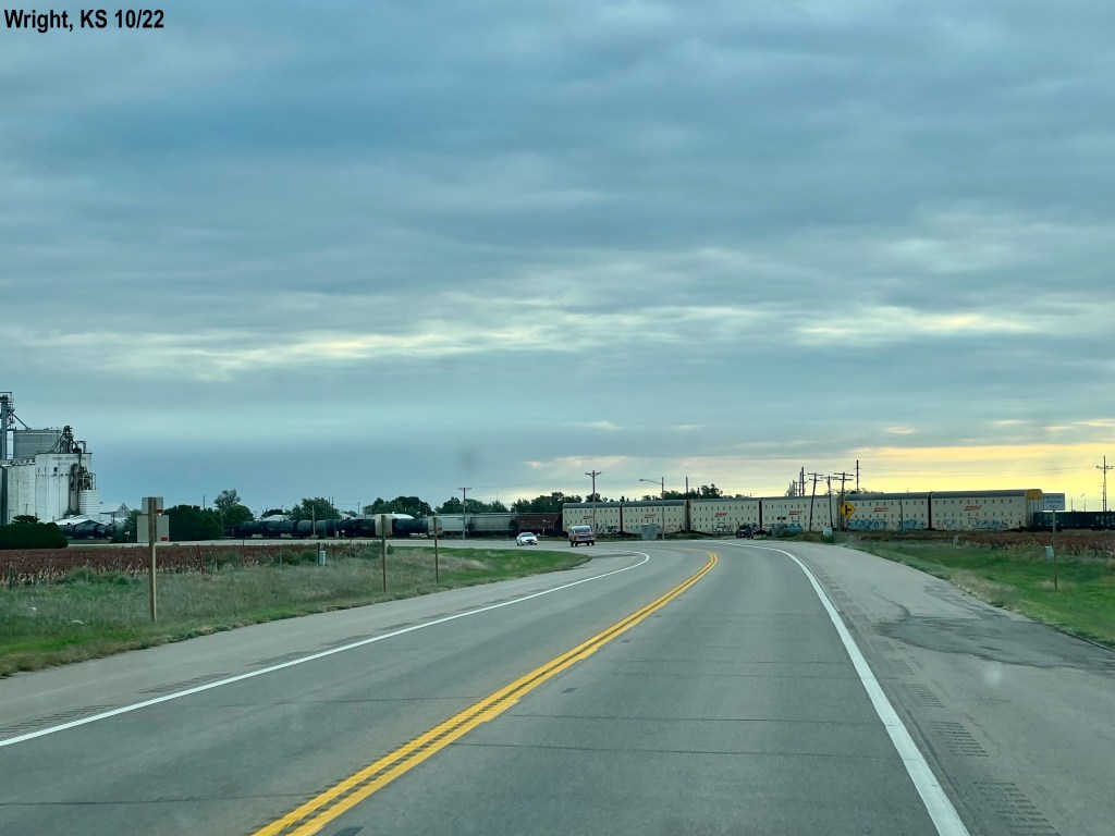 We headed east on Hwy 50 out of Dodge City, KS. At Wright, KS, we both saw a train in front of us. There was another train on the siding and I wondered how long we would wait for both trains to get across on the one track. Kevin started slowing down to be prepared to stop. Then as we got close, we saw the road turned a sharp left and didn’t go over the tracks at all. We started laughing and realized we BOTH thought the road crossed the tracks. We were belly-laughing.
