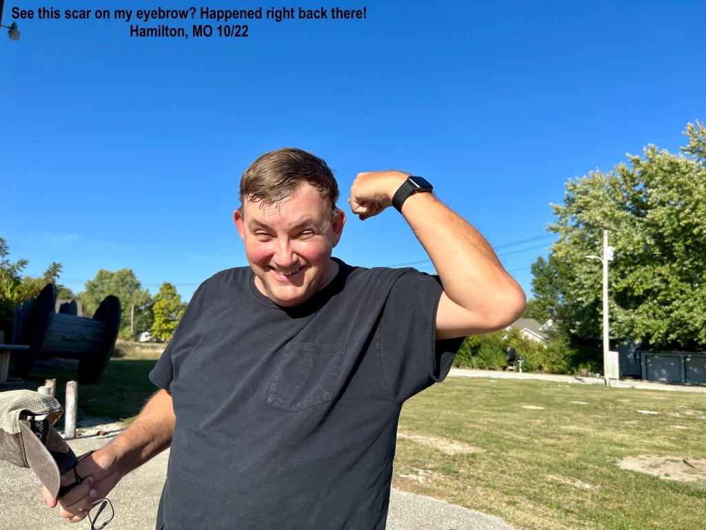 “See this scar on my eyebrow? It happened right back there!” Swinging around swing set pole.