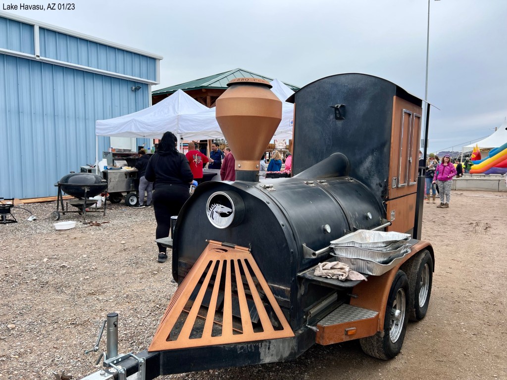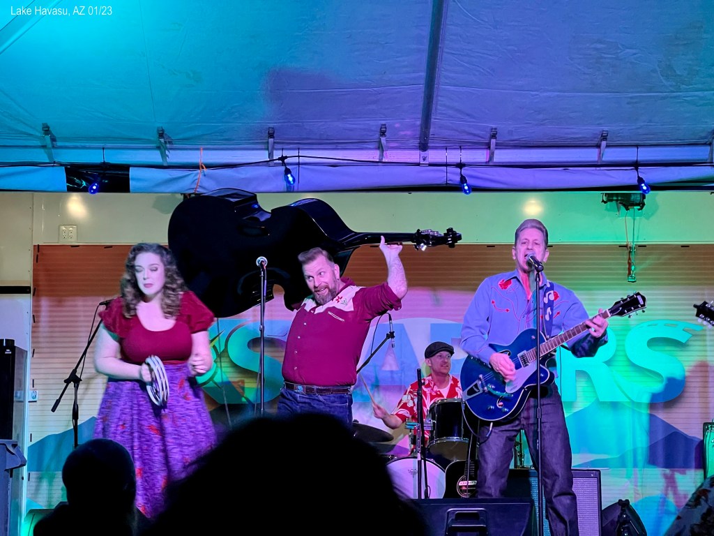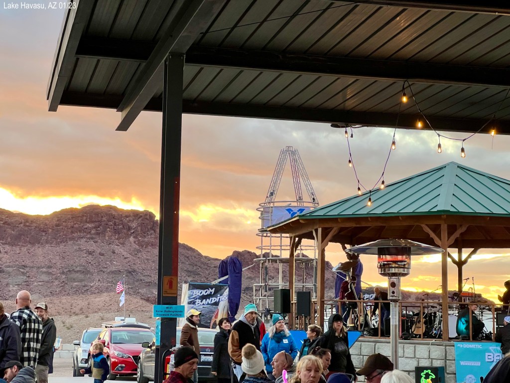 Saturday at noon we went to see the session we hadn’t heard of before. It was: Gutted Season 2 Premiere w/ Cast Meet & Greet. This is a TV show where each team has 5 days to build out an RV, van, and school bus. The show wasn’t captioned so I just watch the video. It was the first time the cast had seen it. Then the cast went on stage and answered questions. At 5:00 was catered BBQ by BBQ Bandits. I looked them up to see if they have a restaurant in Lake Havasu and sadly, no. The meal was fantastic! BBQ pork, beef, or chicken sandwiches, potato salad, Cole slaw, Mac & cheese, I can’t remember what else. They used Sweet Baby Rays, our favorite sauce. A couple we met during trivia joined us and we had a great visit. From 7:00-9:00 PM was an act from Las Vegas named Lyte Bryte. They are a music group and wear neon flashing lights on their costume. Very fun! Everyone was invited to wear neon and boy did people go all out. Fun to see. The group performed on the gazebo. We had fun and danced along with the beat. At one point, the guy leader in the band said his pants were falling down and he needed a safety pin. After the girl sang the next song, he came back and said he was given 12 safety pins and a box of pins. The girl was surprised people had brought so many. He said, “Well, their homes are right there” and pointed to all our RVs. HAHA  At 9:00 pm – midnight, the entertainment was Boom Bandits. He is a DJ who “provides an obscene amount of fun with their professional entertainment and one-of-a-kind contraptions.” It was a dance party. We stayed for just a few minutes and then went home. Kevin could hear the beat, music, and even the DJ talking clear over in General 2 parking where we were. Sometimes, when you are ready for bed, it is nice to be deaf. 🙂