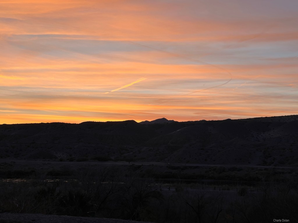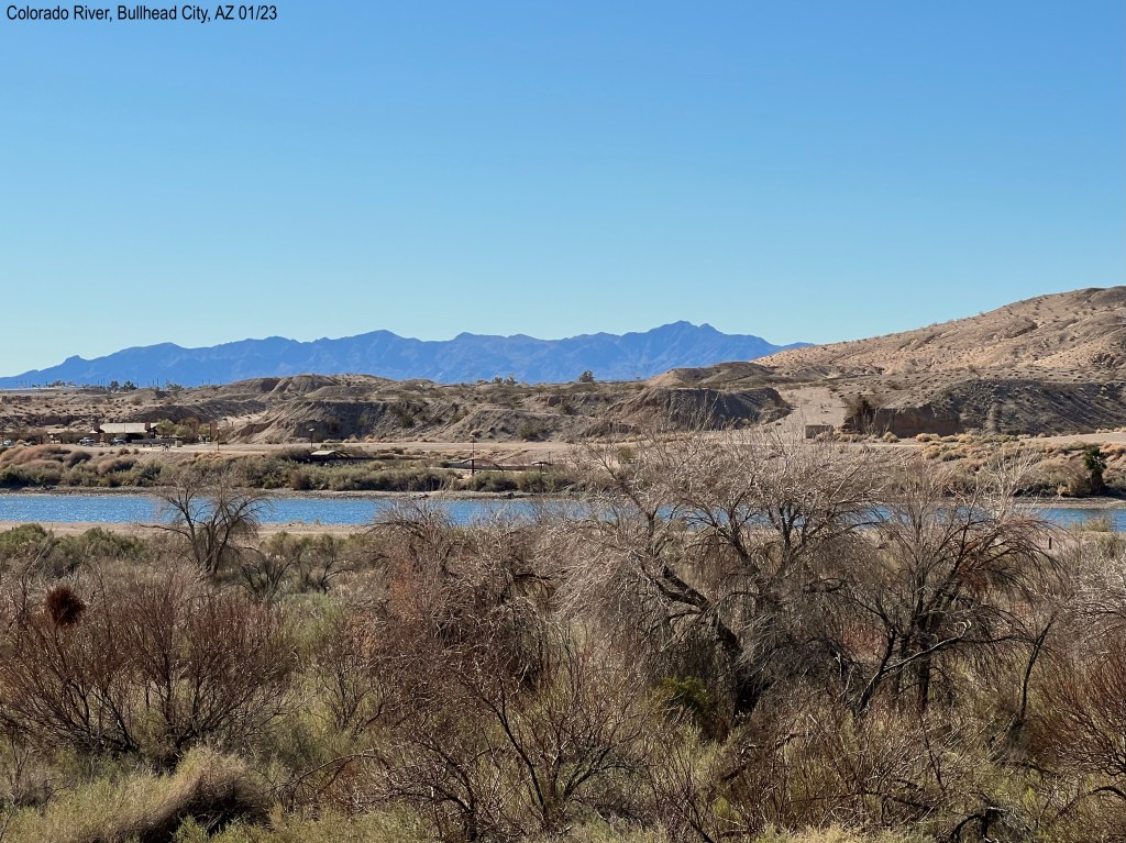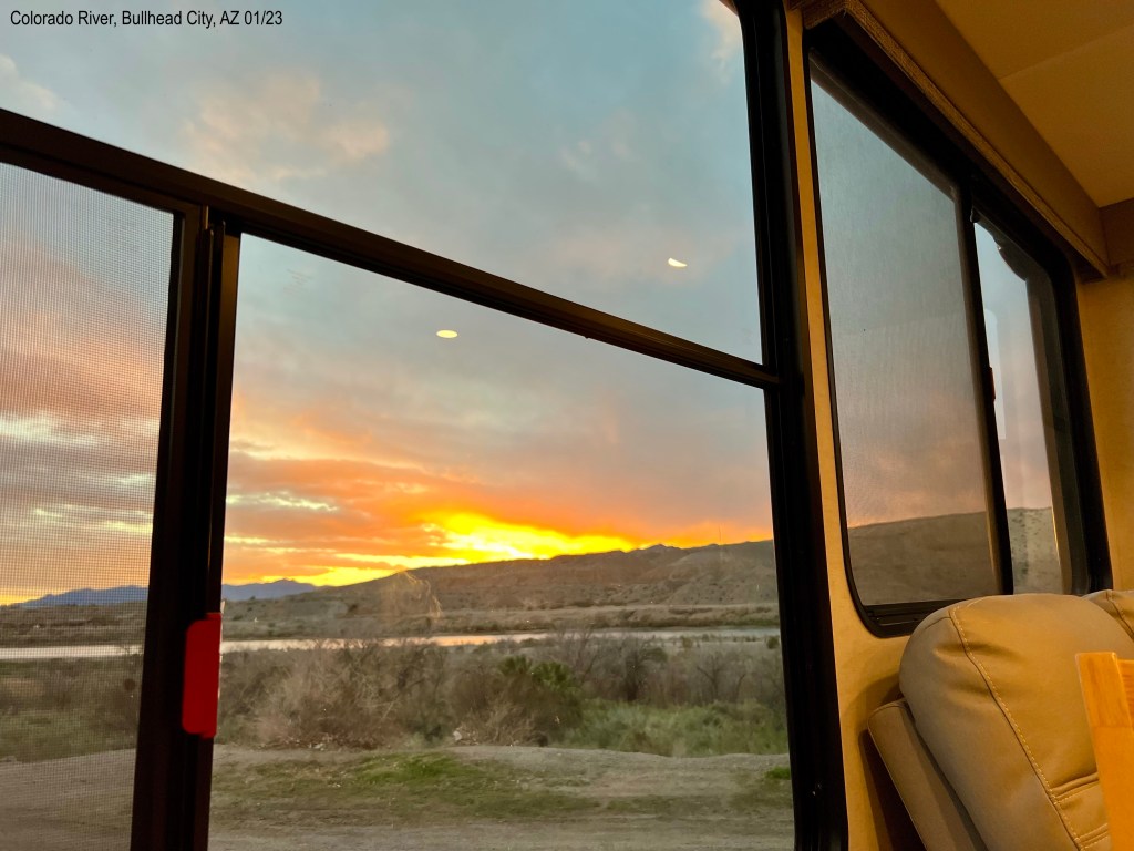 We have a good campsite. Looking out our living room windows, which face west, north and south, we see a dry marsh, a day area across the river, and the Colorado River. The sunsets were beautiful over the mountains.