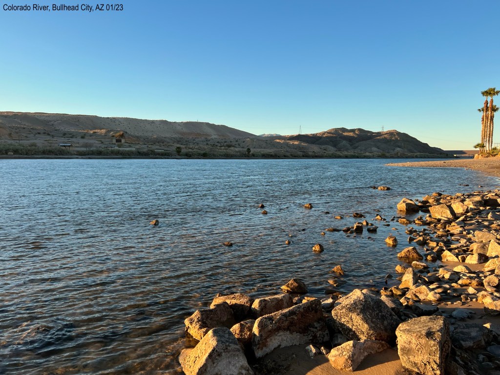 After we left Lake Havasu, AZ we got set up at Davis Dam Camp Park. I saw online the history of this place. This campground is the exact site where the town was for the people building Davis Dam starting in 1946. So cool – even the same roads in the same spots. There were more than 100 houses back then. Most of the houses were actually picked up and moved to areas south of here once another city started up and Davis Dam Camp was changed to surplus property. There are a few houses remaining and are still lived in.