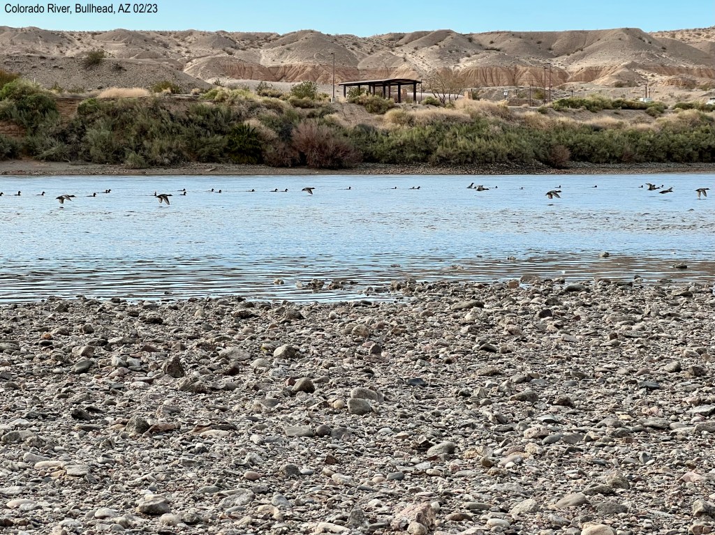 One evening we walked to the south end of this campground and down to the beach. We saw ducks in the Colorado River. They would float down stream, bobbing their heads and bodies into the water getting food. Then, at the same place, all of them (there were almost 100), would turn in a nice, wide, sweeping curve and head up stream. They would paddle to stay in one place for a minute then a group would fly north to where they started. It was fascinating to watch! Almost like a human carnival ride: gather up, okay, go.
