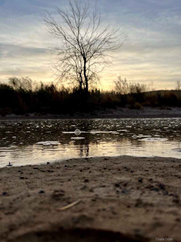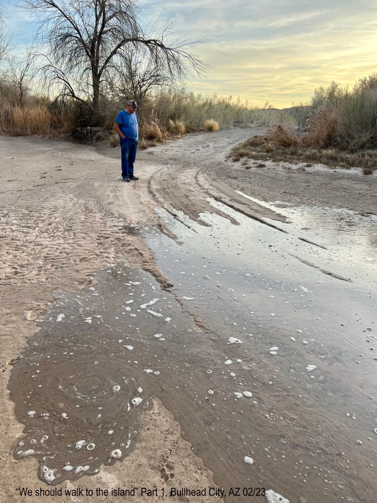 Yikes: Took a walk along Colorado River one evening. We saw where the Colorado River has an overflow to the side. In between the river and this overflow is what looks like an island. The overflow part was dry. Kevin headed us over there and was going to get on the top of the “island” to see the other side of the river. We looked and water came slowly moving towards us on the dry part.