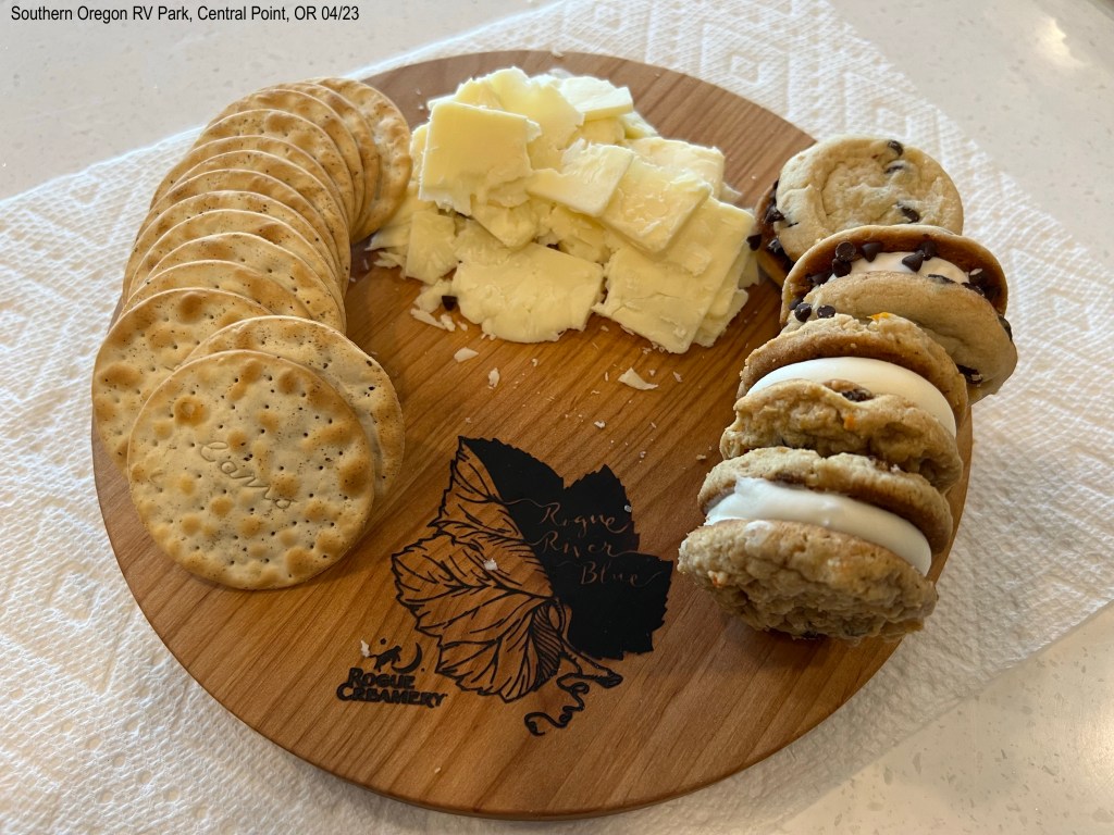 We drove through Jacksonville which is about 15 miles west of Southern Oregon RV Park in Central Point, Oregon. The downtown looks really old and I wondered if the buildings were original. We think we might come back here another day. We then drove Hwy 238 about half hour north to Grants Pass. The drive went through a few small towns. Saw a few small grape fields, and some cattle. The trees aren’t thick here but you get that “away from it all” feeling in some places. We headed over to Rogue Creamery farm stand and dairy. We knew we were almost 3 hours before the last tour so we wanted to see if it was worth hanging around for. The store was very small. The lady behind the counter said people can’t walk around and look at the cows because the farmers are working. Understand that. We quickly came to the conclusion that it wasn’t worth waiting for the tour. I grew up next to a large dairy farm and Kevin was around them growing up, too. We ate our picnic lunch and headed back on the old highway that we came on. Kevin said “I got a different view going the other way” on the same road, different direction. HAHA