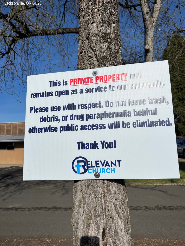 The few spots to park were full so we crossed the street to a church. We were shocked to see these signs posted all over: “This is private property and remains open as a service to our community. Please use with respect. Do no leave trash, debris, or drug paraphernalia behind otherwise public accesss (sic) will be eliminated. Thank you! Relevant Church.” I thought that was really kind of the church.