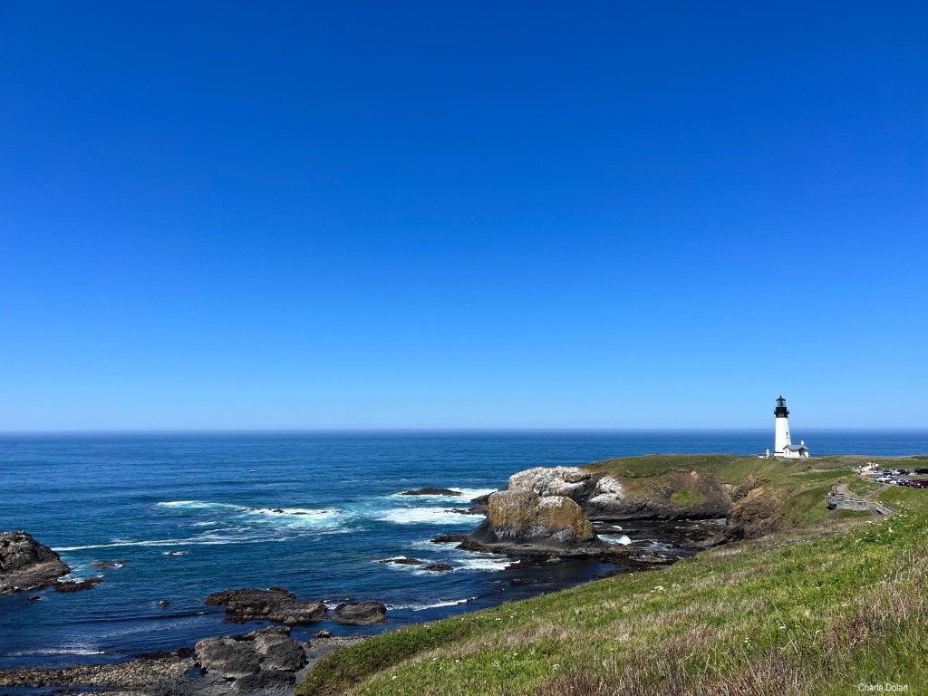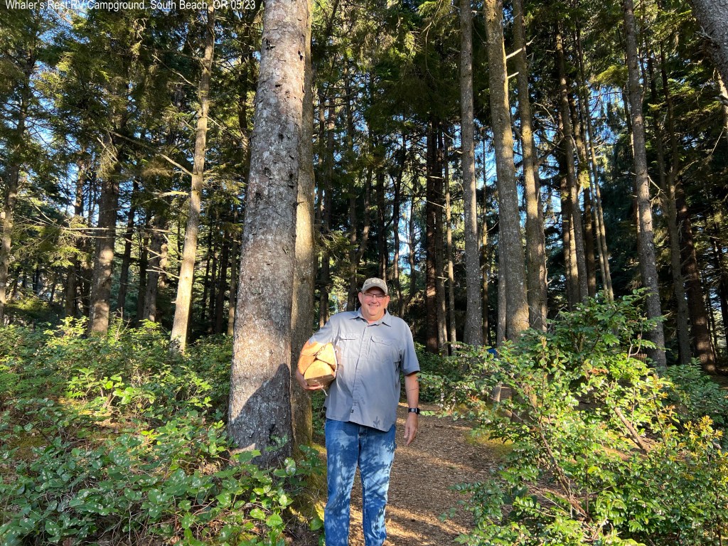 Next we headed north to Depoe Bay. We saw people with camp chairs sitting next to their vehicles looking down at the waves crash the rocks. We got parked and walked around the edge. Kevin heard two older ladies talking about seeing whales and they had their iPhones ready for pictures. We watched for little bit and soon Kevin pointed to a whale. I squealed with delight as I was also able to see it’s long body in the water. It was right up close to the rock/cliffs. What a great day! We saw a guy on the outer cliffs, past the fence, fishing! His line had to go down a 100 feet!