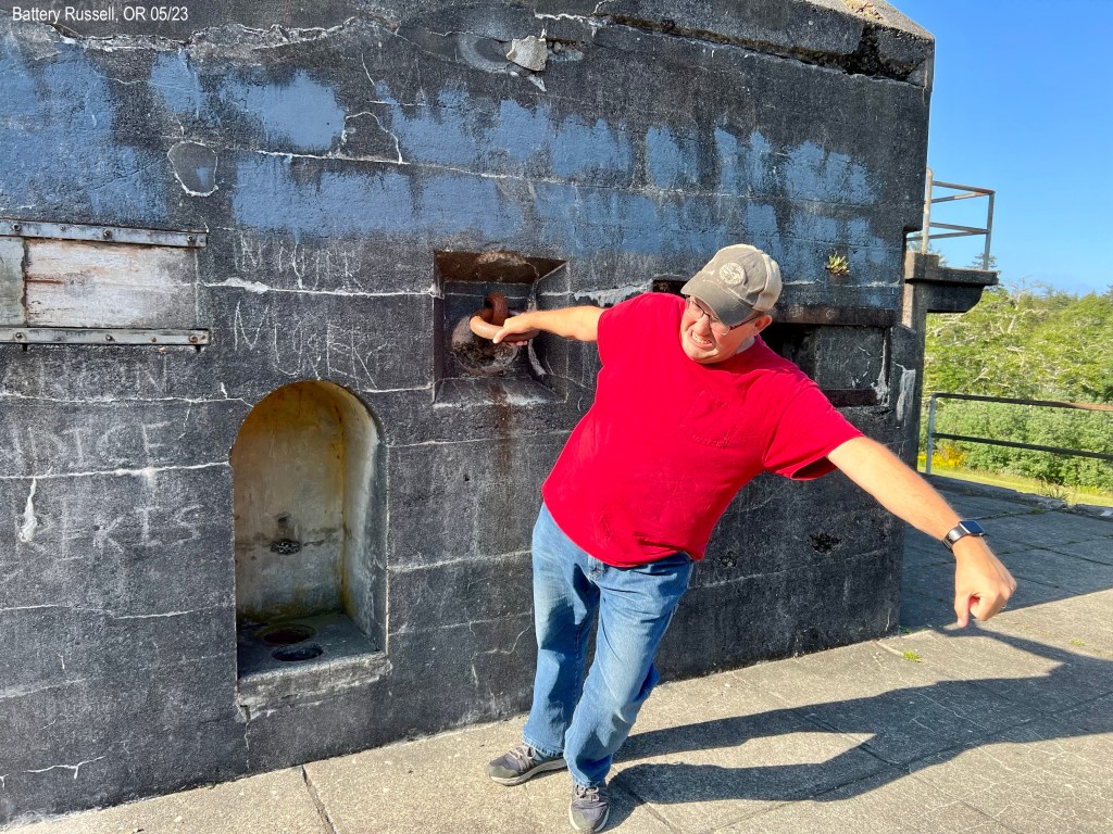 It was fun to see Kevin pulling on the large hooks where chains would have been attached to hold the guns. We sat at a picnic table in the sun for a few minutes and talked more about the place. At a gas station, while he filled up the truck, I looked for a restaurant, since he offered to take us out. It was 6:45pm and most places were closing at 7:00pm. We decided to go to Mo’s in Seaside; we had seen it yesterday on our walk. Along Broadway we passed Tom’s Fish and Burgers and decided to eat there instead. The place was empty of customers and very clean. We both had cod fish and chips fries. It was tasty! We wondered what the old building use to be; this one and the two across the street have their front doors at an angle to the intersection. The worker didn’t know.  Back at the campground, the neighbor across from us had been smoking yumminess. Last night he smoked ribs and tonight was pulled pork. Even though I was full, my mouth watered. Kevin had talked with the guy yesterday when he was doing something with HOWE (footnote 1). The guy said was smoking all sorts of meats all week long. Ah the smells at a campground. 🙂