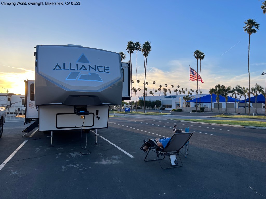 We got to Camping World in Bakersfield at 3:30pm after 430 miles. Went in and three people, again, very friendly, said we could park across the street at the Camping World collision parking lot. It was perfect weather – nice and warm, sunny, with a slight cool breeze. We set up our camp chairs right next to HOWE and read and relaxed. We had asked the three people inside where to eat. They all, at the same time, said “Crest Bar and Grill”. They laughed and said, it is across the street at the KOA. HAHA It is good they told us about it because we wouldn’t have gone there thinking it was for KOA campers. The food was delicious: I had French dip, Rated: Once a Month; Kevin had green pepper, cheese, meat sandwich he rated the same. Back home (footnote 2) we sat outside until dark and read. I told Kevin I smelled rain – but not a cloud in the sky. He laughed and pointed to where the sprinklers had just turned on in the park strip. We went to bed around 9:30pm.