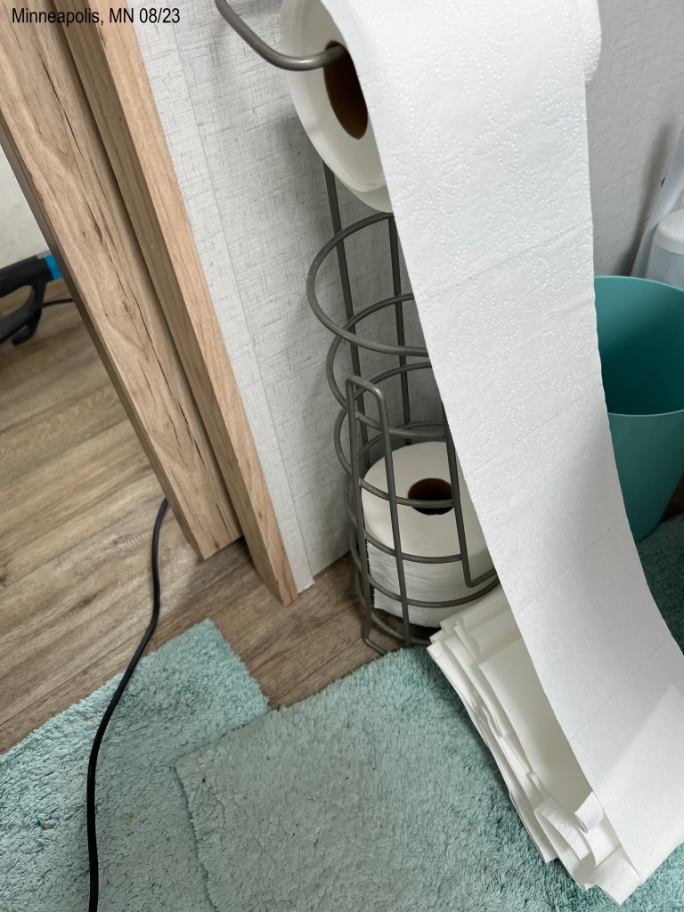 This is what happens when someone forgets to lay down the toilet paper stand before a travel day. They say, whoever “they” are, that any type of RV going down the freeway is like a earthquake. I believe it – some of the roads we have been on are enough to tear things off the walls! I thought this was hilarious, how the toilet paper unrolled and yet made a pretty nice and uniform pile as it went back and forth. 🤣