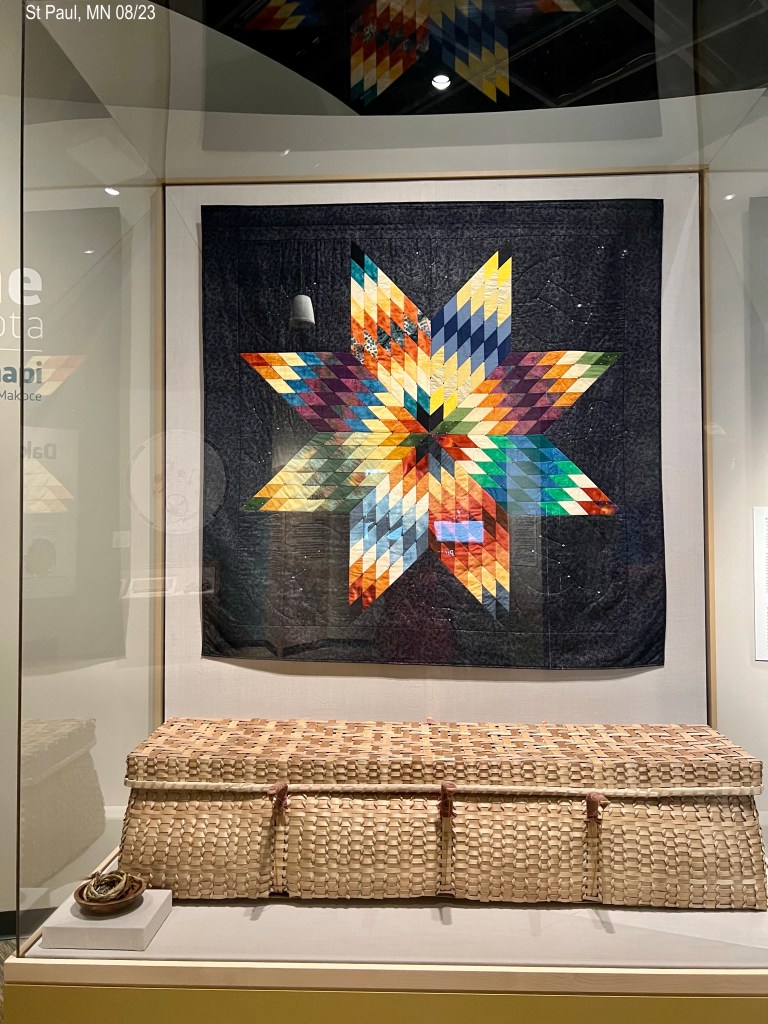We went to Minnesota History Center, downtown St Paul, in the afternoon and evening. On Thursdays they are open late, until 8:00pm instead of 4:00pm. That is nice. We very much enjoyed the place. They had a lot of hands on exhibits and real life, Then vs Now, Weather, Native American History, etc. The quilt, in the picture above, had a sign that said, “A Gift Is A Symbol Of The Giver’s Regard For Person Receiving It.” Native Americans make Star Quilts like this as gifts.