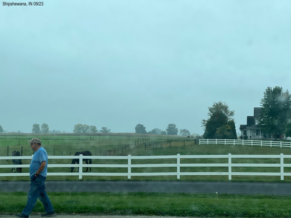 So fun to see the Amish-Mennonite homes and farms along highways 5, 20, and 120 in Indiana. We got to Twin Mills Campground, near Shipshewana, and found it to be a very nice place. The place has lots of tall trees – a problem for Starlink (footnote 3)! The leaves are green and yellow and a lot are on the ground already.