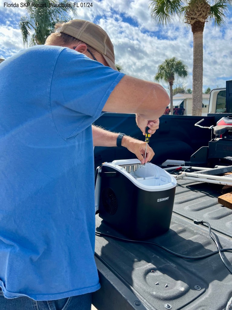 It is also good to be a handyman. Here he is fixing the ice maker.