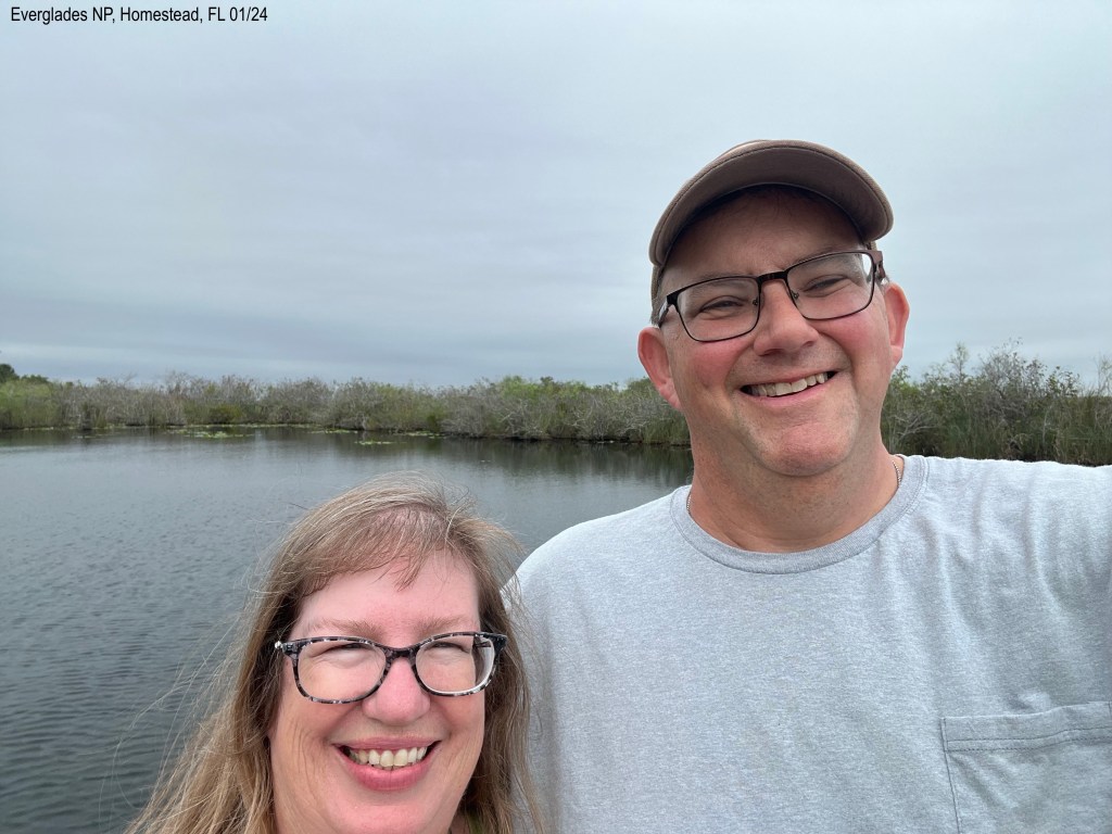 We decided to walk the short Anhinga Trail that goes around water. I literally walked down the center of the asphalt path watching both sides for another creepy-crawly! On one side were thick trees and bushes with water at the bottom. On the other side was a small-ish lake/pond with seagrass, and lots of lily pads. Yep, soon enough, we saw people pointing and taking pictures at…an alligator. It wasn’t moving and we joked that it was fake, like the mountain sheep in Canada. (Remember, Heather?) HAHAHA But we are sure the National Park service wouldn’t do something like that. We walked the circle and came back. I had Kevin take some funny pictures of me laughing but looking horrified and pointing at the alligator. Pretty funny.