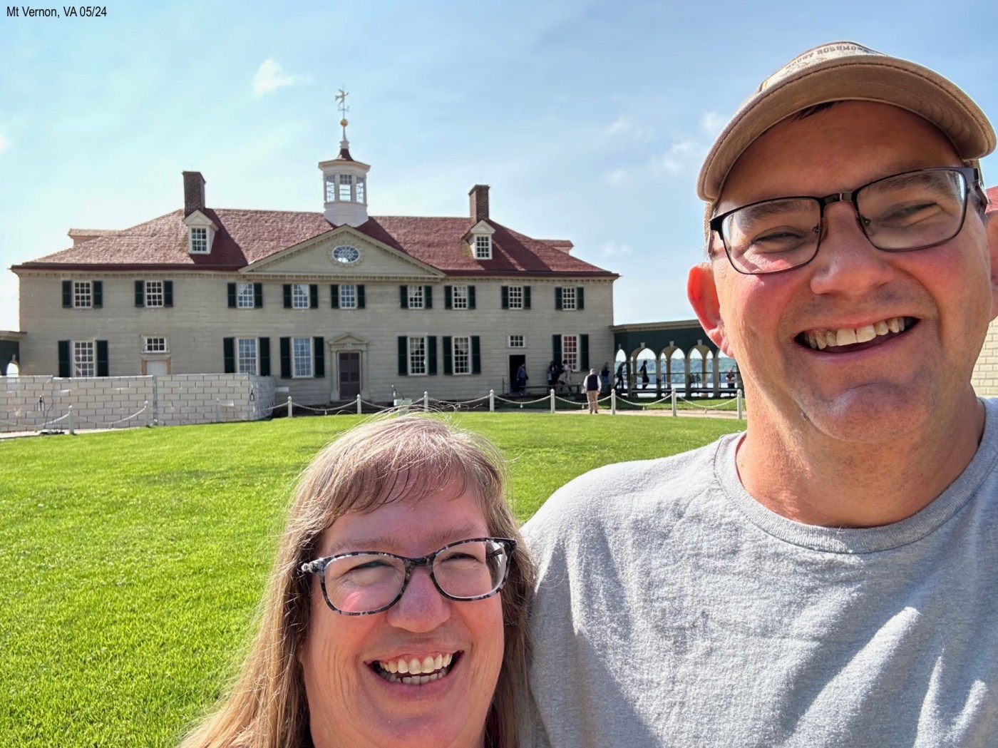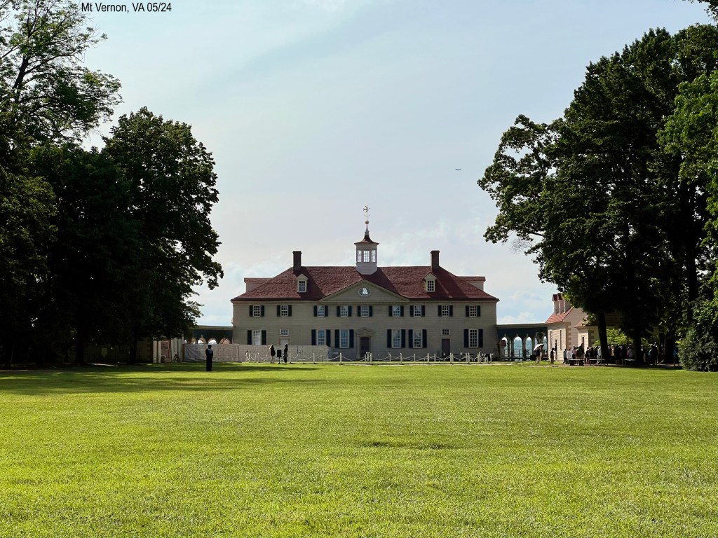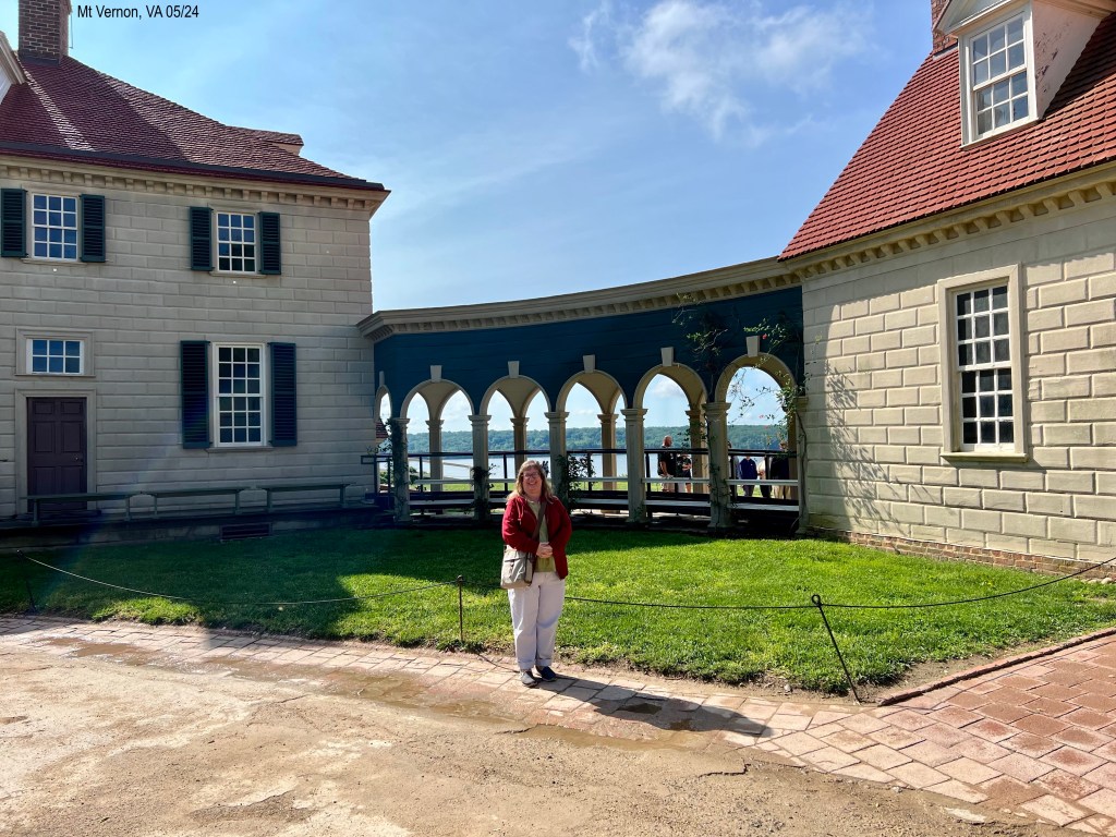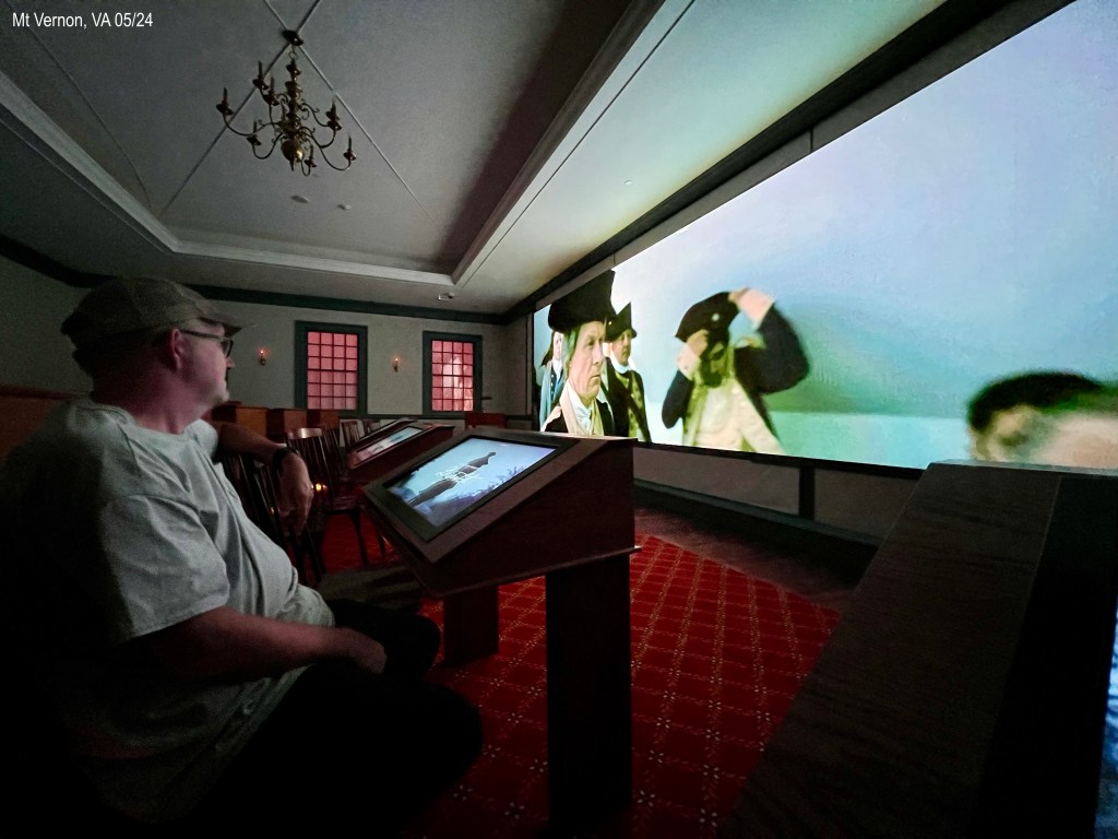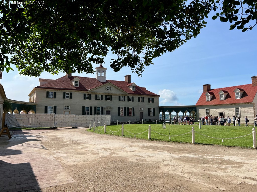 From our campground in Colonial Beach, VA, we drove about 1.5 hours north to George Washington’s Mount Vernon. Just north of Fredericksburg, where we merged into I-95, was the longest collector road we have seen. Miles. At one point, there are two separate freeways going north and two going south plus a middle freeway that is for commuters. The commuter lanes are directional. They sure have done a good job figuring that out! George Washington’s Mount Vernon is privately owned, since 1858, by the Mount Vernon Ladies’ Association. The ground are immaculate and parking easy. We got there right as the place opened at 9:00 a.m. Weeks ago I had emailed them for an American Sign Language interpreter and gave them the dates of yesterday or today, said we were free all day, and listed what tours we were interested in. They responded and set up an itinerary that we liked. This morning there wasn’t a line when we got there but it soon got busy. Workers are everywhere and happy to answer questions. A large map with places to see is on a wall; a lot of people took pictures on their phones to use it as a guide. Good idea to have it there. We started with a 10 minute introductory film. Every film in this entire place had closed captions. This place gets an A. Then we walked outside to the house. We were to meet the interpreter at 10:00 a.m. in the Mansion Circle/Special Tours area.