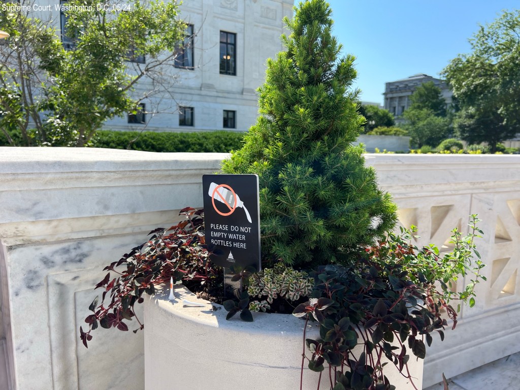 There is even a sign in the planter next to him that said to please not empty your water bottle on the plants. HA We waited a few minutes and then told to go inside. At the security check a guard said you can’t have food, even unopened packaged and no water in bottles. We had to leave and go back outside. I was confused: we have snacks for the day and water, because, you know, you are suppose to drink water especially on these hot humid days. Why were we suppose to throw it all away? (Hang on for the rest of the story!) I really wanted to see the courtroom and Kevin wanted to, too. So we decided I would stay outside with the backpack (with the snacks and water) and he would go through the tour. Then we would switch. After an hour, he came out and I went in. The tour boards and displays gave tremendous information on the history of the court and how it works. Very easy to understand.