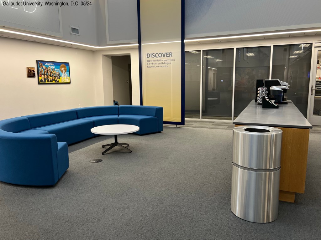 We looked around are learned some neat information. One thing is that the buildings are open, lots of windows to let natural light in (love this!) and the couches and chairs, etc are usually blues and greens in color. That is the best colors to be able to see hands. Also, classrooms and any seating areas are in a circle so you can see others better for signing. There were two other people in our tour.