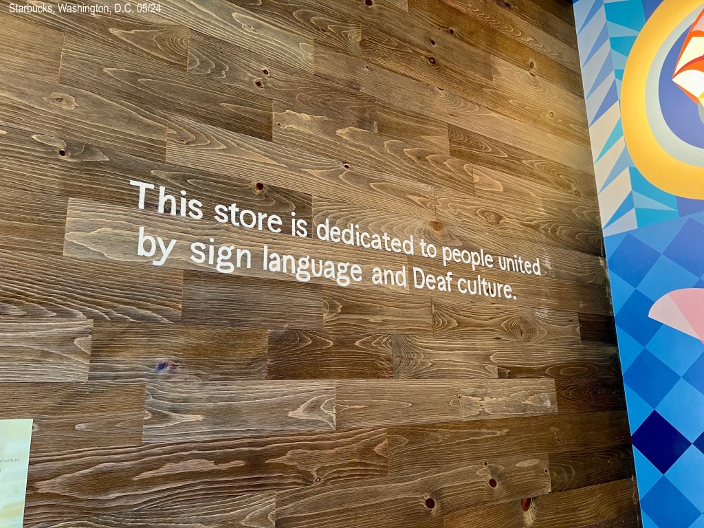 From there we wanted to go to the deaf Starbucks that so many deaf friends have told us about. So we walked there. We walked past houses and then to a street with businesses that went to Union Station. At this Starbucks, the outdoor canopies have hands fingerspelling Starbucks plus it is also in English.
