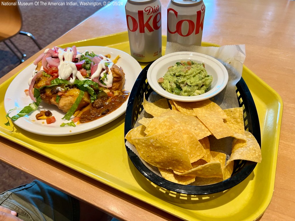 I had read about the Mitsitam Native Foods Cafe in the building. Mitsitam means, “Let’s eat!” The chef is Native American. We had a late lunch there and goodness, it was fantastic. We both had Navajo taco with bison stew on top. I couldn’t tell the different from bison and beef. Lots of flavors. We also ordered chips and guacamole. The lady grabbed an avocado and made it right there for us. Oh the flavors. We laugh and said we each were trying to figure out a way to stay there long enough to have it again for dinner. HAHA The cafe windows look out over flowing water feature and was very peaceful. As we left, it was raining. The rain was gentle and straight down so the walk to the Metro train wasn’t bad. By the time we got home (footnote 1) the rain had stopped.