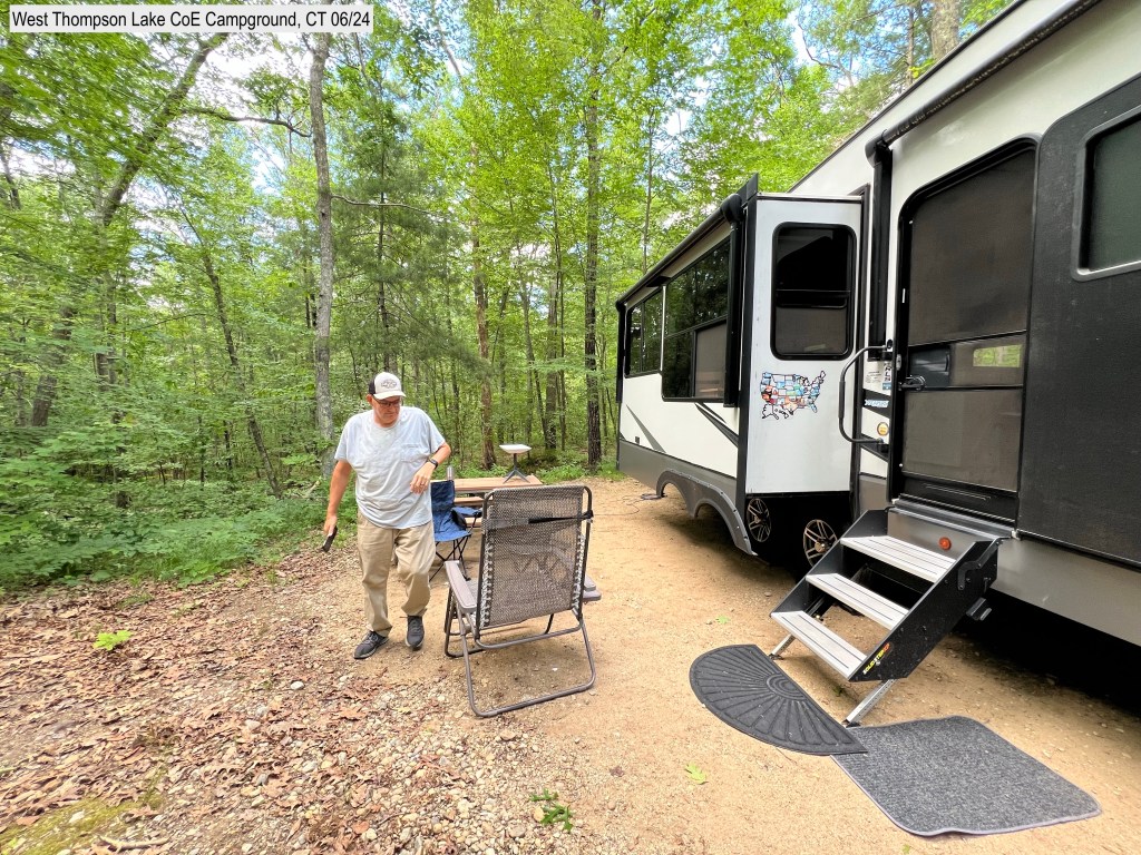 We got to West Thompson Lake Campground, near North Grosvendale, Connecticut, by almost scraping the side of HOWE on a turn just before the turn in. Yikes, Kevin said. This campground is Corps of Engineers and has 24 sites, 11 have electricity 30 amp and water. It is thick heavy woods. Starlink is not happy! Cell service was slow but worked. We got set up and then did a little walk down the hill to the ranger shack. He gave us a paper on trails and how to get to the lake. (Can’t see the lake for all the trees.) 😃 Oh, this was new to us: the campground gate is locked at 9:00 p.m. – 8:00 a.m. If you go out and come back, you will have to park at the lower lot before the campground and walk in. We see quite a few people tenting and we are definitely the only big trailer here, although we fit fine. HA