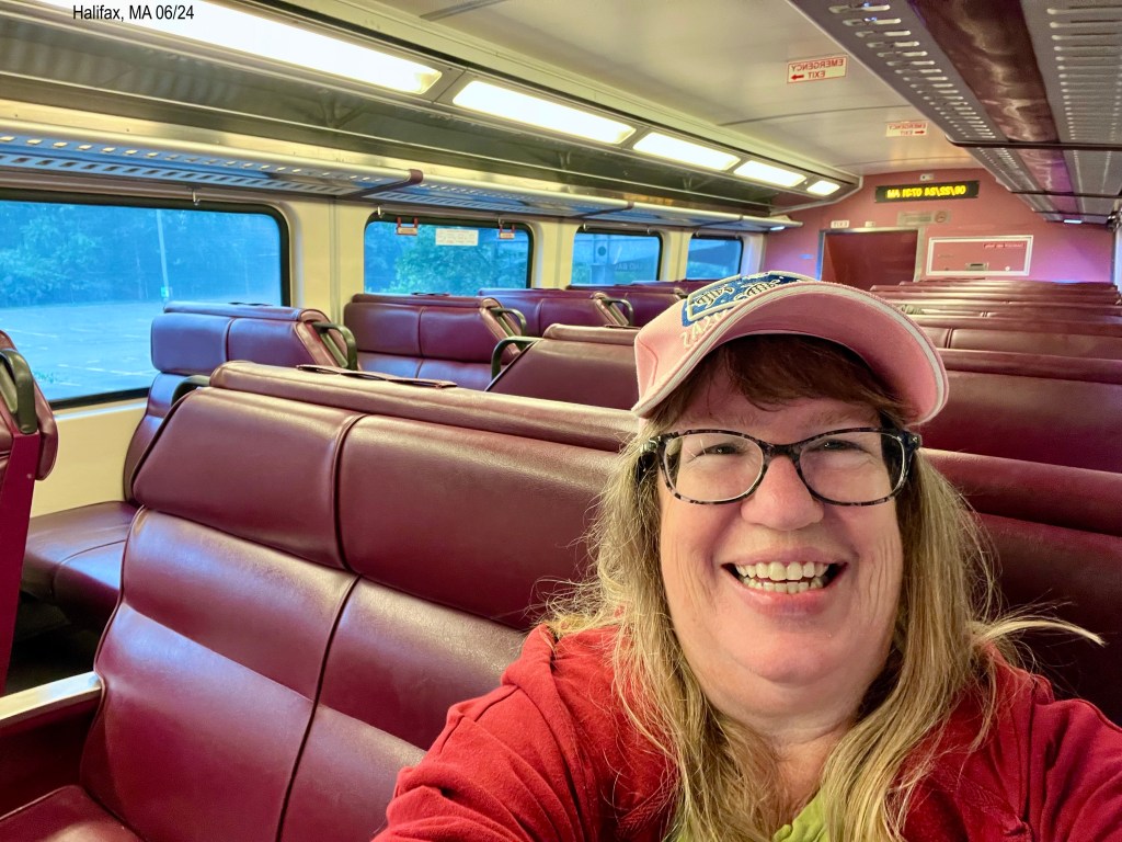 Kevin learned all about the commuter train and the schedules to Boston and then got the payment app on our iPhones. With the Saturday schedule, the commuter doesn’t go as often and starts at 5:09 a.m. with the next one 7:09 a.m. The train ride is about an hour. That is a big time difference. He said we should get up at 3:45 a.m. and drive to the train station to be there for the first one. Well, when the alarm went off, we decided to take the next one and went back to sleep. HAHA We left at 6:00 a.m. and drove the 20 miles that takes 35 minutes due to all the little twisty curvy roads. There were a few vehicles in the parking lot. We paid for parking there and walked to the train platform. We waited and waited and then Kevin looked at his phone again and saw an alert that for this weekend, the train isn’t coming to this end stop due to bridge work being done. HA We decided the small shuttle bus must be for us, as the alert said shuttles would go from there to Halifax, the next stop. The bus driver was sleeping so we waited until the time the train was suppose to leave. He woke up and opened the door. A few other passengers got on as well.