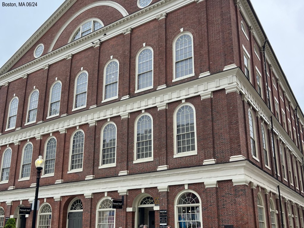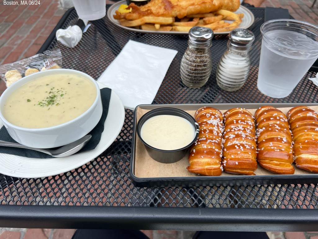 In Faneuil Hall we watched the National Park Service film about slavery and the Underground Railroad. Behind this building is the Marketplace and it is filled with food places. One sign said, “Boston Chowda” and I saw several others with that word, chowda. They drop the R here. We decided to eat lunch there but at a restaurant that had outdoor seating. The weather was nice temp and still no sun.
