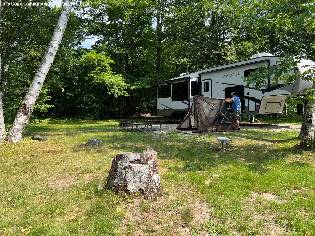 The two lane road meandered through…trees…and small towns. Then we saw long hills. Soon we were in New Hampshire, a first time for both of us. Pretty quick we saw some baby mountains. We were only 460 ft above sea level but saw some peaks that were nice to see through the trees. There are ski resorts around here, too. As we headed north through White Mountain National Forest, we reach elevation of barely 2000 ft and then back down again. Then we saw Mount Washington. This mountain is the highest mountain north of the smokies and east of the Mississippi River. The top is 6288 ft above sea level. I kept checking cell service and we had it right until after the turn off to the campground. HA Kevin set up the Clam because there are tons of bugs here. A nice walk in the evening, just up the road, down to the river behind us, and back. We are in bear country and lots of warning signs on what to do with food, trash, etc. You even have to lock your vehicles because bears can open the doors. Wow.