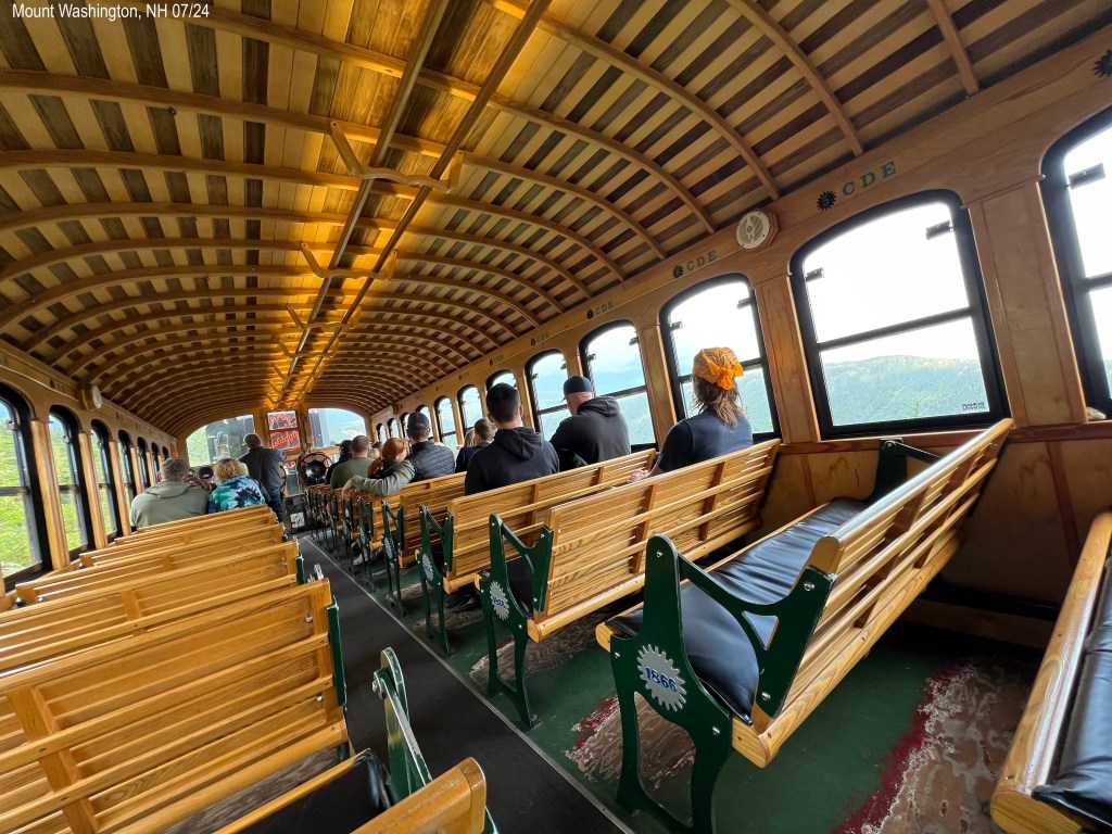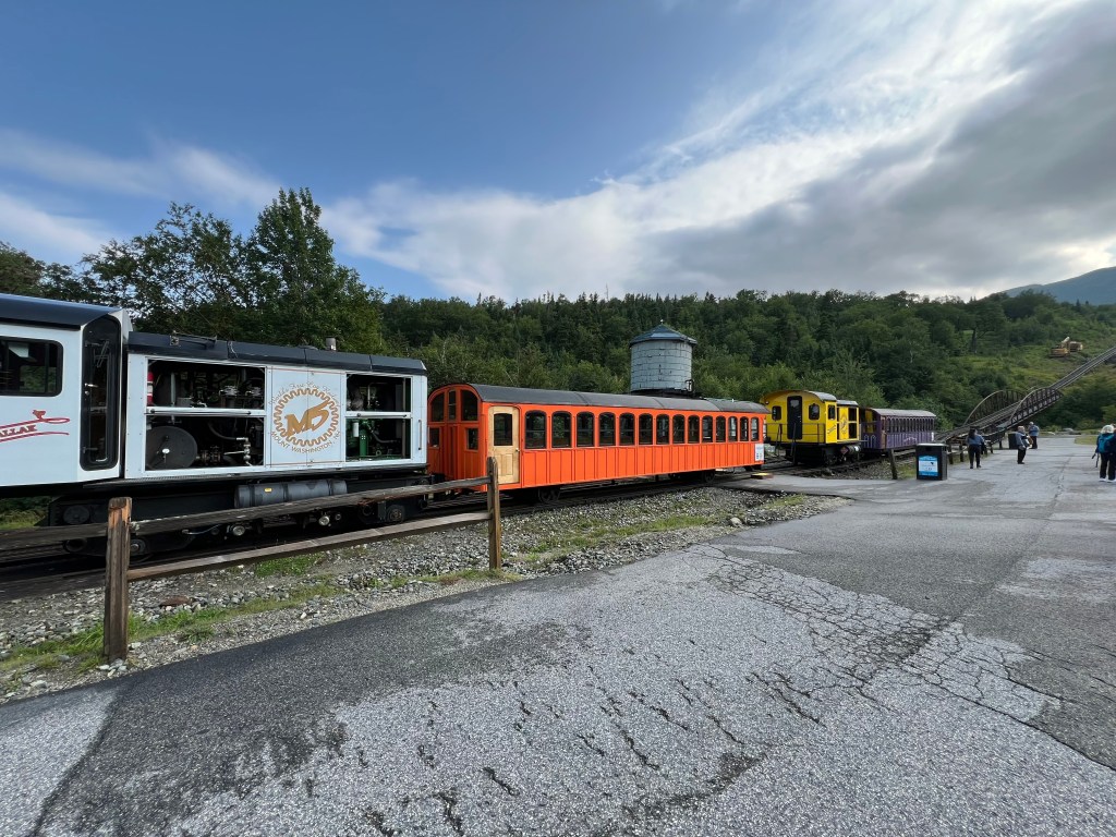 Around 6:45 a.m. we headed out to drive the almost hour to the other side of the mountain. Our campground is on the east side of Mount Washington and we were headed to the west side. Mount Washington Cog Railway climbs to the highest peak in the Northeast. It opened to the public on July 3, 1869. The Cog Railway climbs about 3 miles to the top with an average grade over 25%. One place the grade is 37%. You go 2.8 mph going up and 4.6 mph going down. We didn’t get tickets ahead of time but were early enough in the day to get them no problem. When we walked to the ticket booth, the guy said I had “the best and biggest smile he had seen.” Aww. The tickets are pricey, $84 each, but we felt it was worth it. Kevin then asked if there was a guide on the train who would be talking. Yes and then even before Kevin could ask the next question, the nice guy said they had a script and got me one. Oh, I was blown away! This place gets an A. (I am deaf.) The trip is 3 hours long: 1 hour going up, 1 hour at the summit and 1 hour coming back down. We liked this Cog tons better than a ski lift ride! The only one tiny disappointment was this: no where in the pamphlet or online website, that I saw, did it say what the script and guide told us – there are only 3 days a year that it is clear at the top. The website and pamphlet say how you can see several states and on a really clear day the ocean. Nope, it is covered in a cloud. It would not have changed our plans (although I suspect it would for some people) but would have been nice to be informed ahead of time.