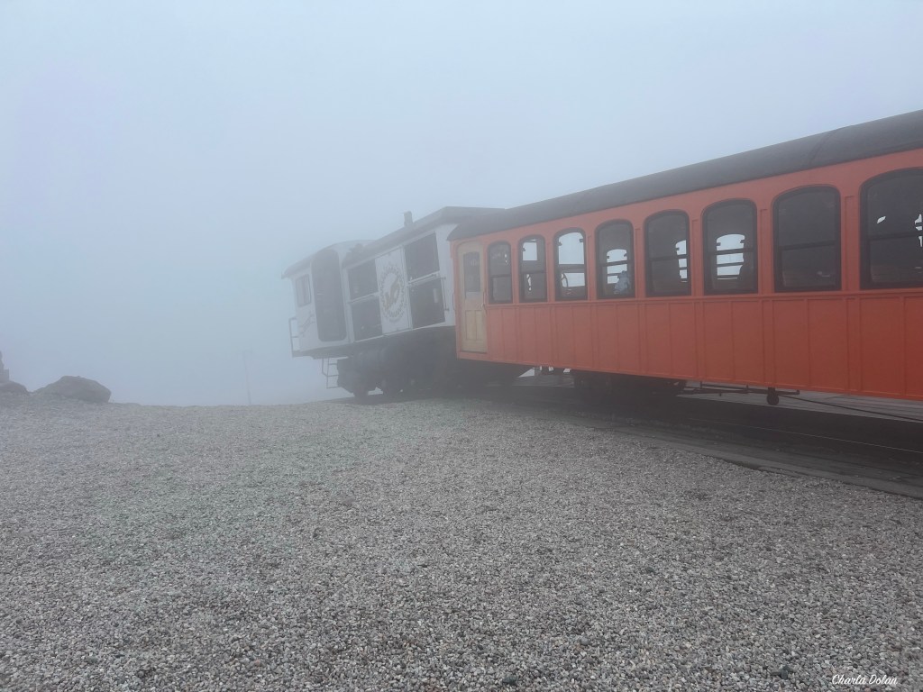 At the top we could barely see a few feet away. One train car is pushed by one biodiesel engine. They have a steam engine that costs more to ride and runs once a day. As we got off at the top, it looked like our engine was hanging off the edge of the world, into the great unknown. Inside the building at the top they have a place for hikers, large room of tables, small food area, bathrooms, and a tiny store. On the monitor we saw currently the wind speed was 35 mph gusting to 39 mph and the temp was 52.8° F with 100% relative humidity. Glad we knew to take our winter coats! I saw in the museum that it reached 72° as a high once. The buildings at the top are chained down because of the winds and can get 72 ft of snow.