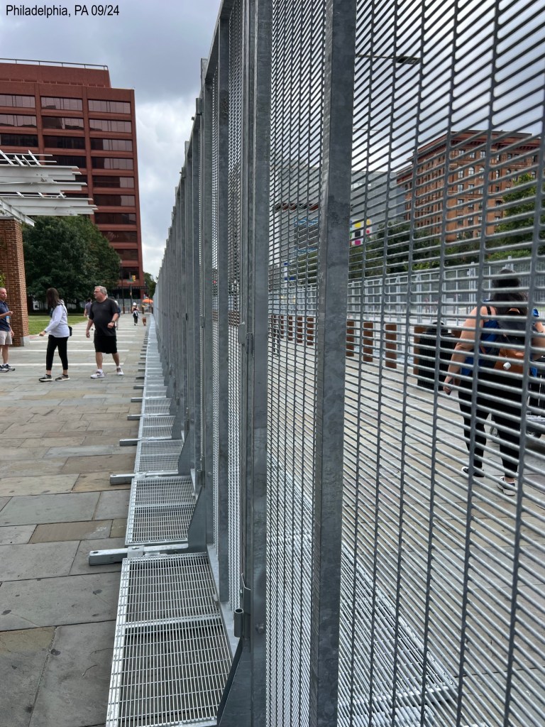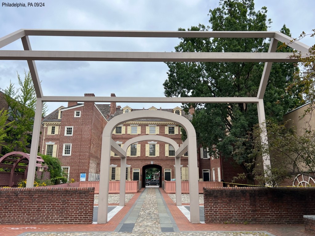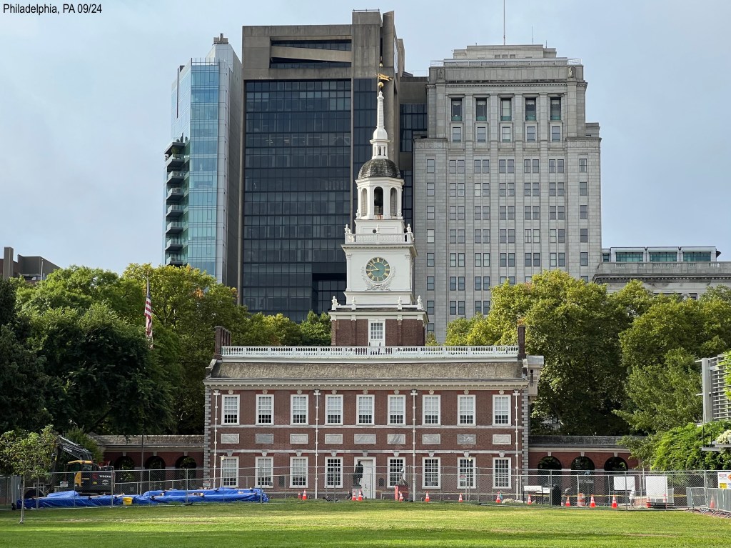 Next we went across the street and around this tall fencing that was being put up to Independence Visitor Center. We asked the ranger what the fencing is for. He said they were all quite surprised to see it this morning; it is for the presidential debate this coming Tuesday with Trump and Harris. It will be right next door at the National Constitution Center. Ohhhh, glad we aren’t coming here that day. After Kevin got some info I suggested to him that we go to the Liberty Bell right now because I was seeing a lot of people. He laughed and said the ranger had just suggested that, too. (I am deaf, so I didn’t hear the ranger.)