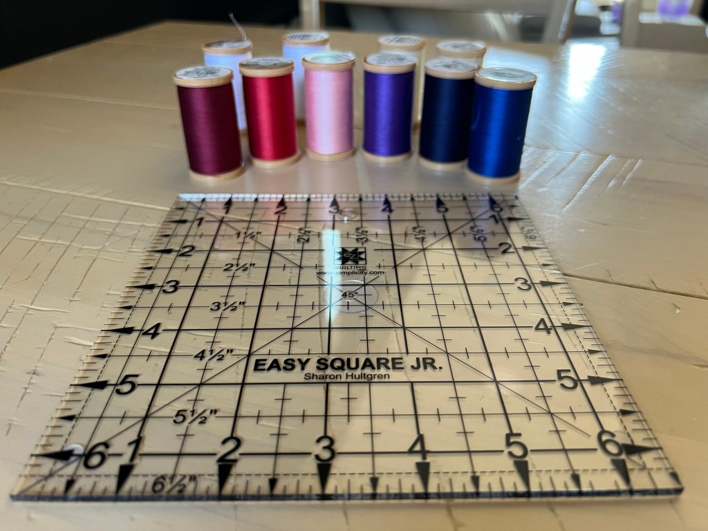 We turned on the A/C for a little while in the afternoon. Ha, it is February! Love it. The temps right now are above normal and might be breaking some records. We like it and low humidity! 🙂 I did a lot of quilting this week. I ran out of thread on top – never had that happen before, so we went to Joann Fabric & Crafts. The company had just announced they are closing all the stores; bankruptcy. Sad. The place had been open an hour by the time we got there and was pretty crowded. No shopping carts available. There was a ton of fabric and right now most is 20% off. I don’t need any but I did find the ruler to square up blocks I wanted. I was so happy to find this last one. The one I have is yellow along the black lines (the signature color for the company) but doing some quilts are hard because you can’t see with those colors. Glad to have this one. I also got a bunch of thread; it was 40% off. Already most of the thread is gone from the shelves. Kevin got some command strips, I think to hang more hats. HA