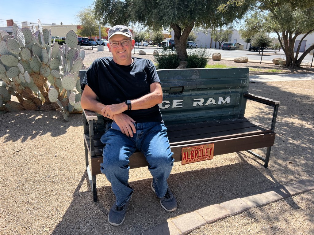 We had a couple options for what to do today (a Saturday). One was to go to Coolidge town Cotton Days. We first thought this would be a neat way to learn about the cotton grown around here but then we realized it is a town annual festival. We also wanted to go to the historical museum here at Casa Grande. From their website it said it is open Thurs-Sat noon to 4:00 p.m. We got there a few minutes after noon and the gates were deadbolt locked. We tried several gates and the same thing. Maybe the main gate is on the other side. Still locked. Then Kevin suggested we cross the street and see the Casa Grande Neon Sign Park. We thought they displayed it very well. It is outside, with lots of AZ bushes and such, and with a sign for each sign with good and long descriptions. We liked that all the signs were from this town. They have several benches where the back is a tail gate from an old truck – Ford, GMC, Chevrolet, and Dodge Ram. Of course I had to take Kevin’s picture with him sitting at the Ram one. 🙂 Back across the street and still all gates were locked. On their billboard it lists the same days and hours as the website and also has a phone number. Kevin called but only went to voice mail. Disappointing, as from the website, it looks like we could have learned a lot about this area. Oh well.