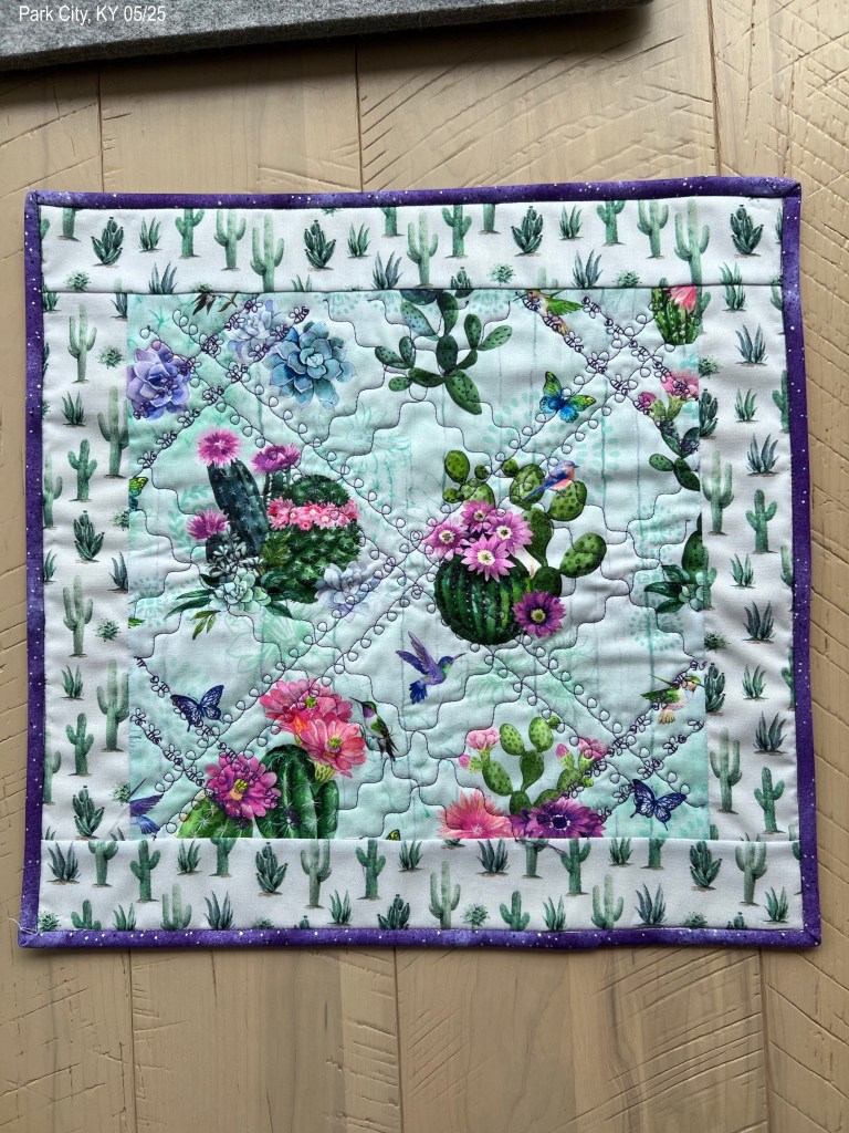 This day I did the first square for my “Fabric Places Quilt.” (Above, left.) My “Fabric Places Quilt” is going to be mostly 6 inch square blocks, each from fabric we have bought around the country. It should depict the area. I am able to cut out little pieces to show-and-tell of the area. The one with the darling cactus I did a 9-patch pattern. With my machine I stitched the city, state, month and year at the top. Turned out cute. I need to remember to trim between the letters later when I put all the pieces together. So/sew fun! 😉