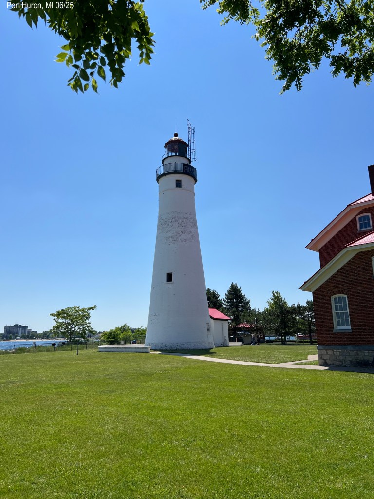 We walked a few blocks to Fort Gratiot Lighthouse. Our tickets included a tour of the grounds and climbing the lighthouse. We got to go inside the lighthouse keepers house. It was used until recently. However, it was redone to look like it did in the 1930s. The kitchen used to be in what is now the dining room but someone back then made the wood shop into the large kitchen and moved the outhouse farther behind the house. The lighthouse used to be 65 ft tall but captains complained they couldn’t see it so it was added on to be 82 ft. The tour guide said a storm years ago was so bad the water was 1/2 way up this lighthouse! The sand eroded so much that they later determined if the storm had lasted one more hour, they would have lost it. Of course the lighthouse keeper was at the top keeping the light lit. Wow. Inside the lighthouse, I chose not to climb the stairs. I have been dizzy today (common from vertigo with my ears) and didn’t feel safe to climb. Kevin went up and took some neat pictures. We saw a bride, groom, and wedding party taking great pictures around the lighthouse and the beach. The fort hospital was there for us to see, as part of our tickets. It was just two large rooms with a few beds and information. We walked back to the truck at the museum and drove to get something to eat. I was really surprised there were no restaurants or food trucks around this whole beach area.