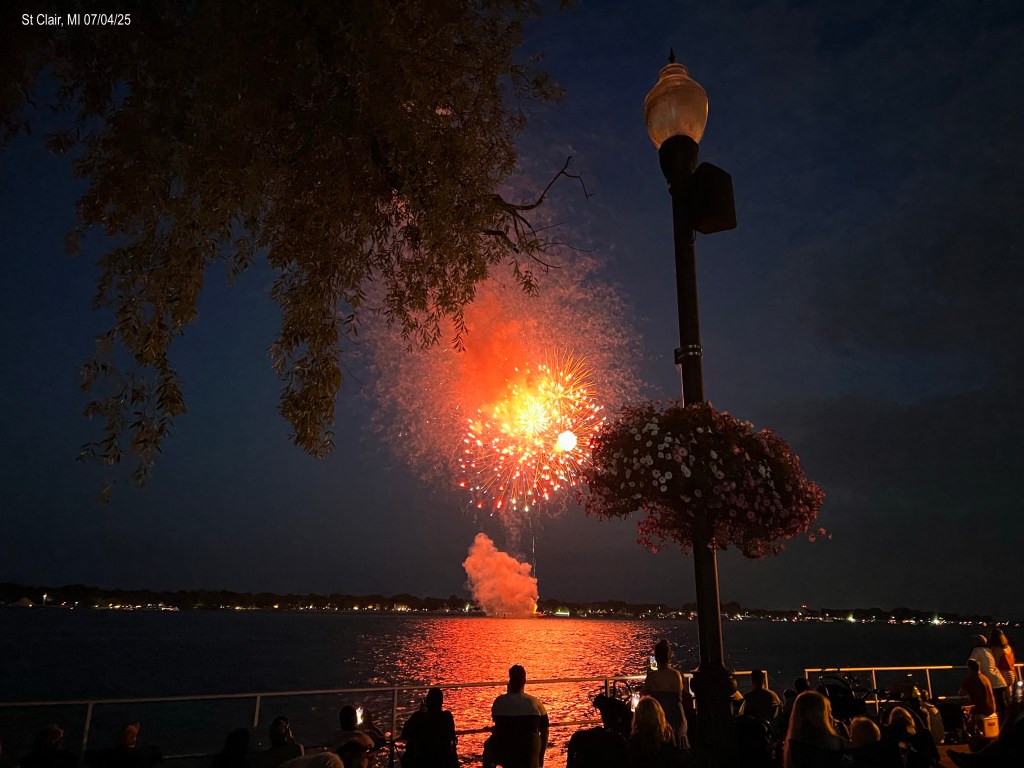 We took the long way home, through the small towns and side roads. It added 40 minutes but only 10 miles and we enjoyed that drive. After naps we left at 5:00 p.m. to go to St Clair. This was very good timing that Kevin picked. We parked in the recommended place on their website. It was right across the blocked off street. There were a lot of people and stuff around but we found a good spot to set up our chairs. We noticed people had staked down tarps to save their places. One spot even had twine running back and forth between stakes. There were food trucks there and live music on the other side of the street. I had packed a cooler with food for us. I made fruit salad, tortellini in olive oil and parmesan cheese, and chips and guacamole. Of course the fireworks didn’t start until way dark – 10:00 p.m. But we had a good time watching people, watching the boats, walking around, and Kevin visited with a family next to us. We saw 2 border patrol offers and 4 police officers walking around.