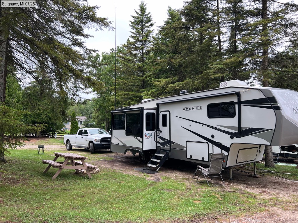 Travel Day to St Ignace, Michigan, in the Upper Peninsula. It was fun to cross over the Mackinac Bridge. This is a 5 mile toll bridge over Lake Michigan and Lake Huron. It is the only road to the Upper Peninsula from the rest of Michigan. It took about 25 minutes to get across because of stopped traffic; then you paid the toll at the end. It was $8.00 for our truck and HOWE (footnote 1).