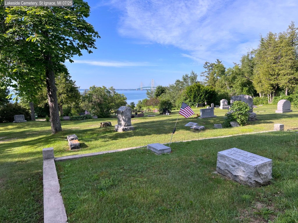 Find A Grave (footnote 2) – we went to Lakeside Cemetery, here in St Ignace. It is right along Lake Huron and you can see Mackinac Bridge. The view from the cemetery is very pretty. We were there a good chunk of time and I got a lot done.